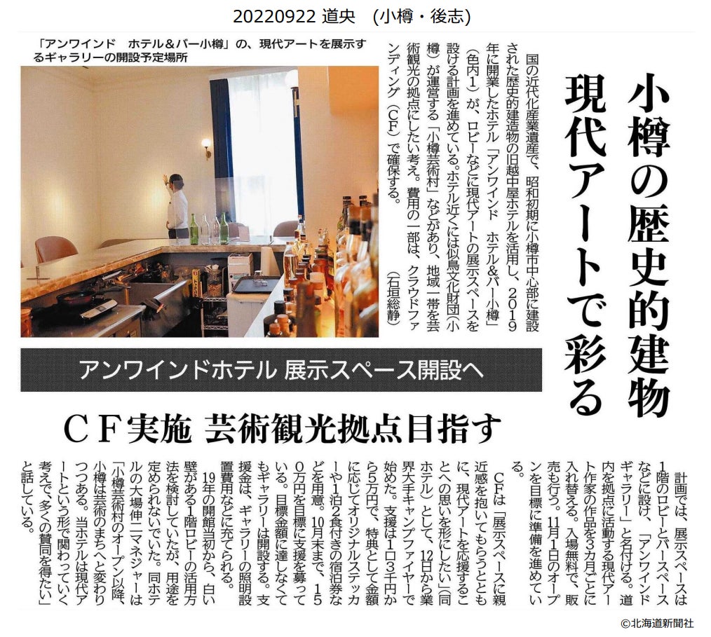 2022/09/28 13:43応募期間残り33日、達成率10%と、思う様に支援が集まらず、クラウドファンディングの難しさを痛感しています。が、なんとか少しでも追加支援を得られるよう、引き続き頑張っていきたいと思います。そこで「折角だからホテルにアートを見に立ち寄って、食事やドリンクを楽しんでみたい」という方々向けに、リターンを追加しました。地元小樽の方々はもちろん、小樽を日帰りで訪れたい方々にマッチした内容となっています。是非ご検討ください!引き続き応援よろしくお願いいたします。UNWIND HOTEL & BAR 小樽大場 もっと見る【活動報告】9月22日/北海道新聞小樽版に取り上げて頂きました!達成率9%。ここから巻き返しを図りたい!!