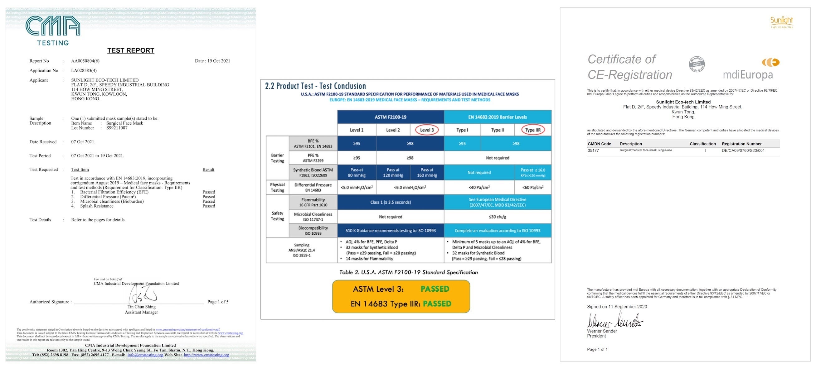 米国規格であるASTM F2100-19の最高ランクLevel 3欧州規格のEN 14683:2019 Barrier Levelの最高ランクTypeⅡRの認証を得ているほか、EU規格であるCE認証も取得しています。