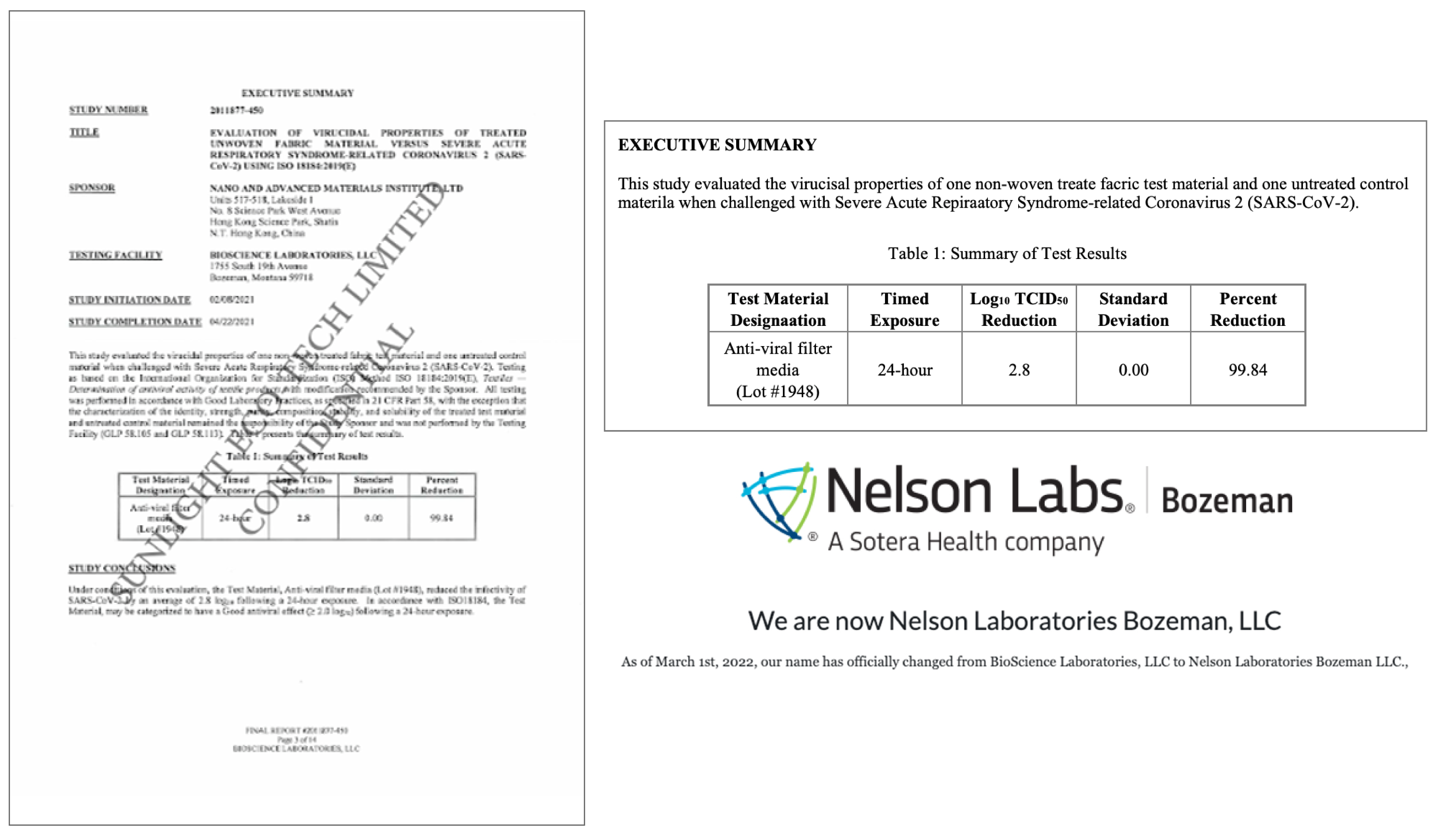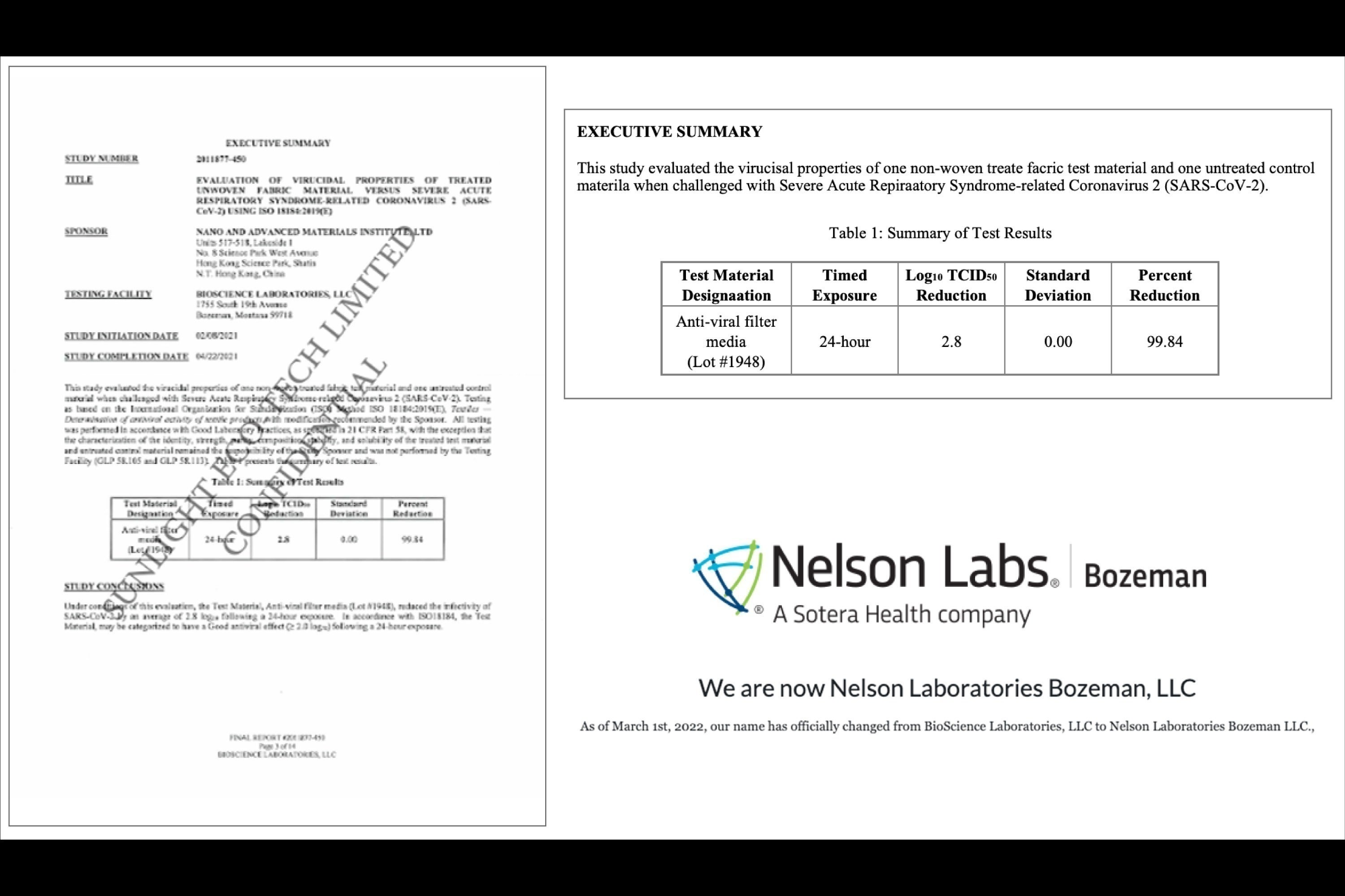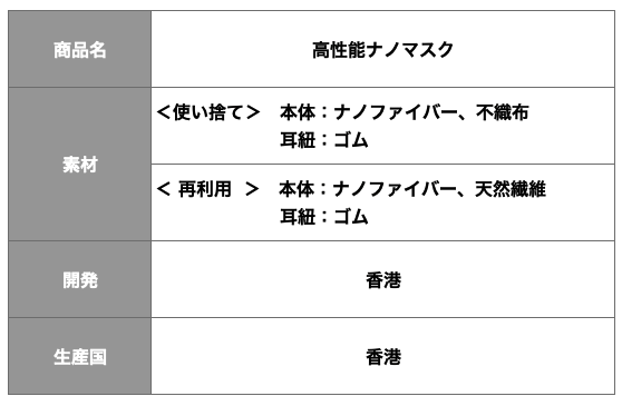 【高性能ナノマスク】のフィルターには、Nano and Advanced Materials Institute (NAMI)が開発し、バイオサイエンス・ラボラトリーズ(米国、現:ネルソン・ラボラトリーズ)で検査した抗ウイルスのナノフィルターを採用しています。