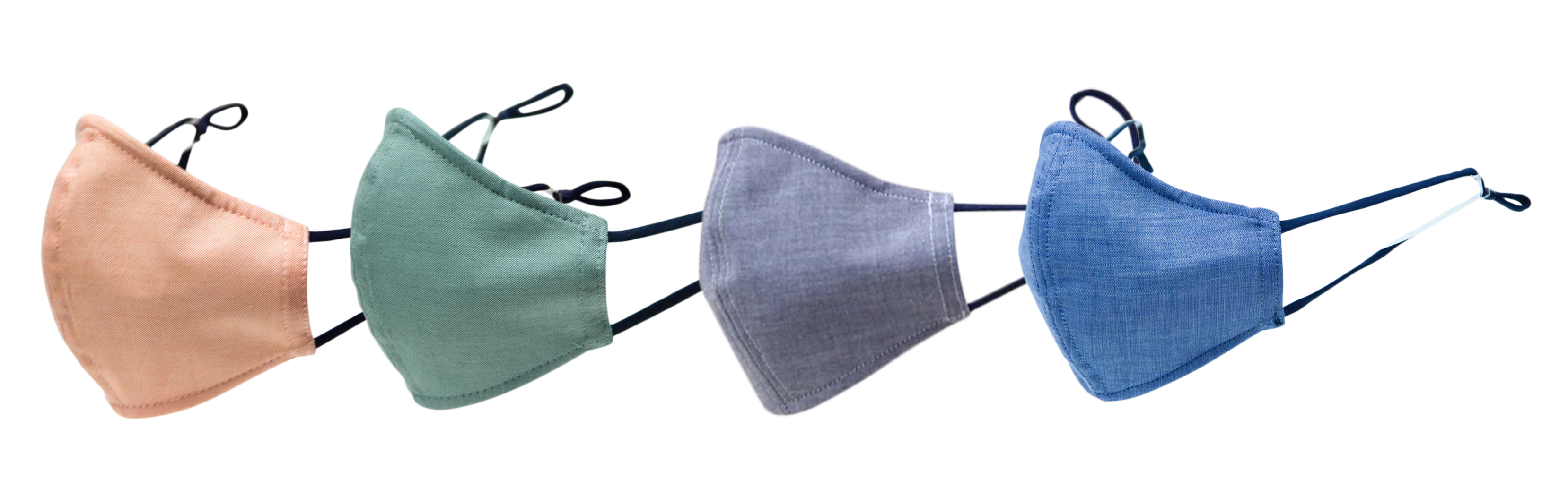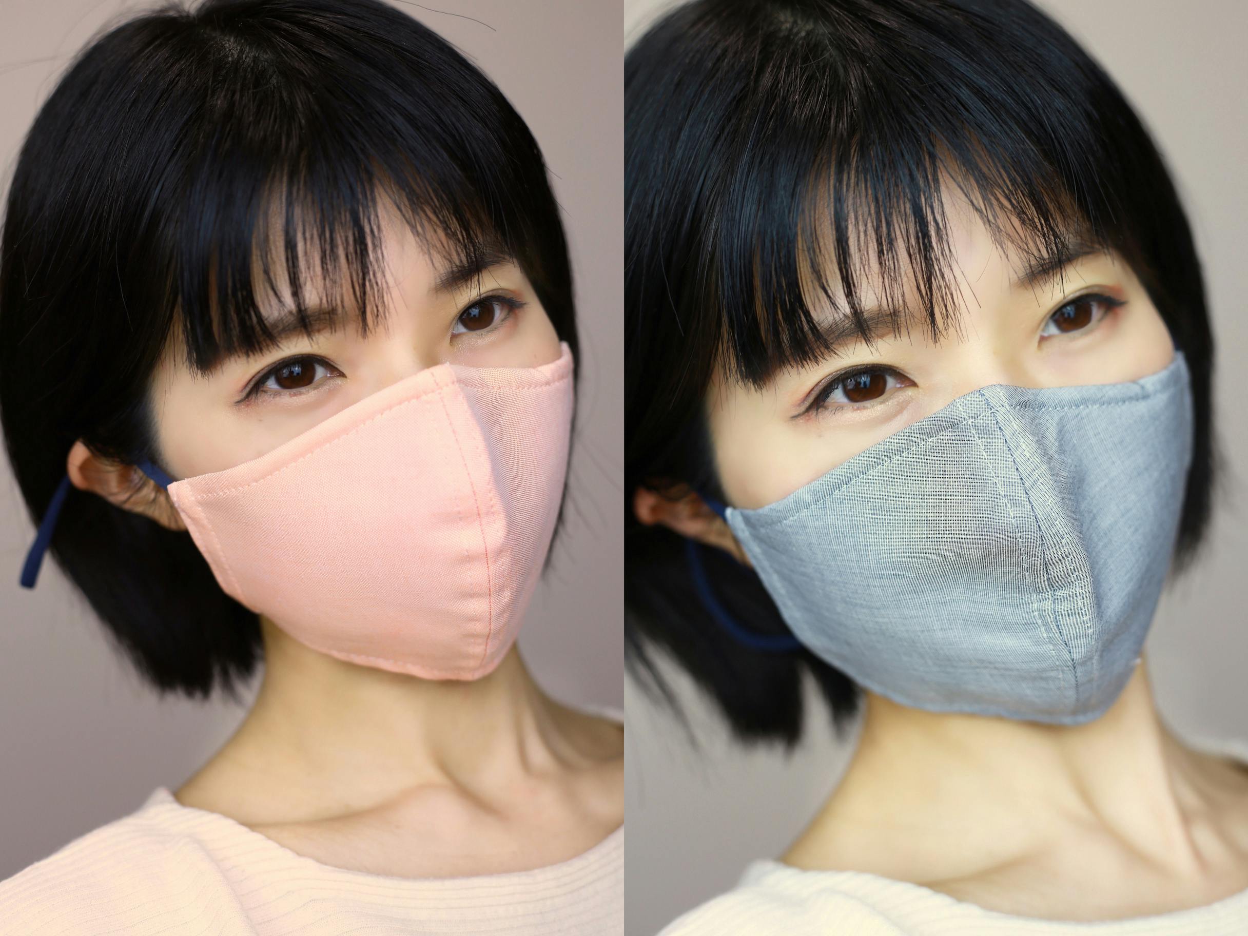 ナノファイバー薄膜を光触媒コーティングした天然繊維で挟み込むことで、何度も洗って再利用することができる経済的なマスクです。マスクの中心に縦ラインの入った中心立体型の形状です。今回はグレー、オレンジ、グリーン、デニムブルーをご用意しています。