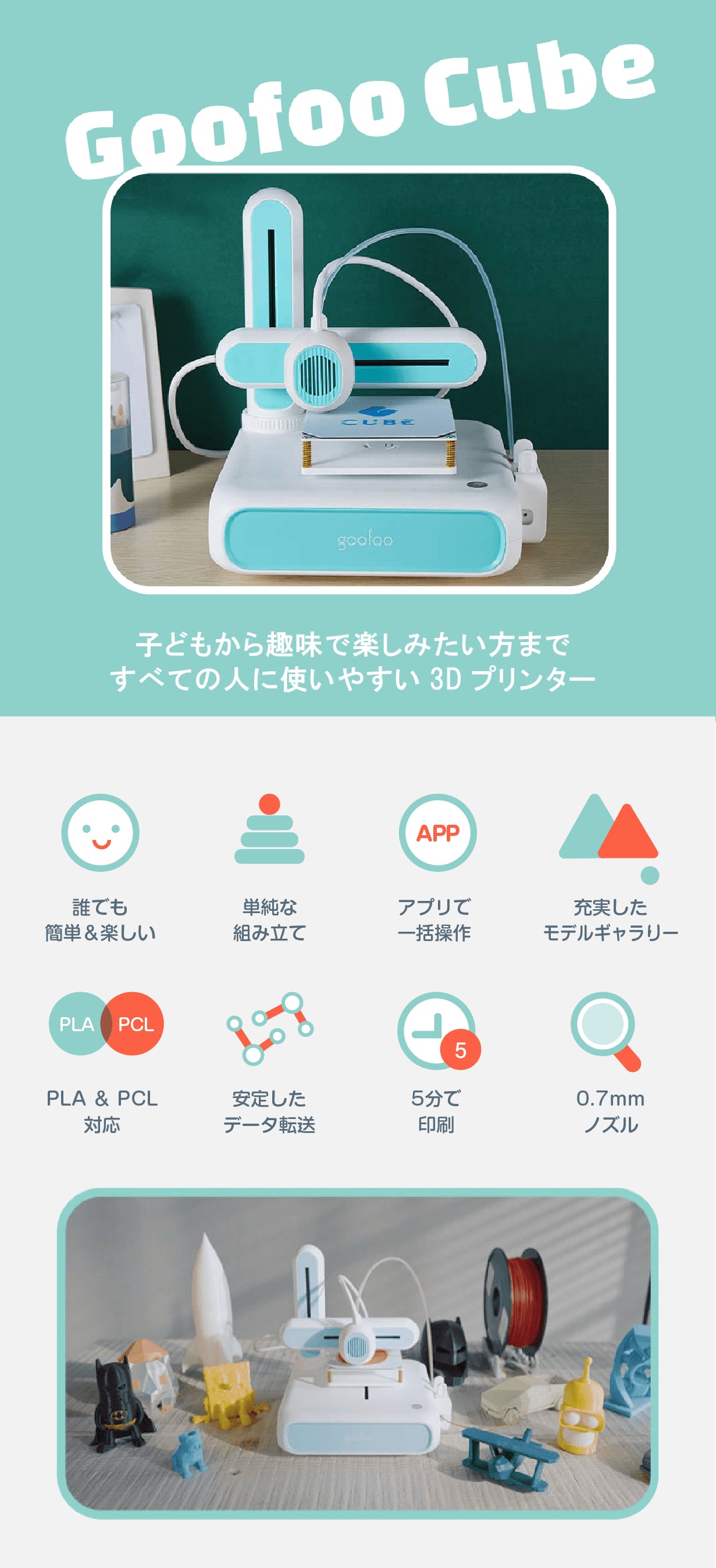Cubeは数秒で組み立てられ、直感的で使いやすく、専用のアプリとモデルライブラリが用意されているので、ユーザーはプリントを楽しむことに時間をかけ、マニュアルを学習する時間を短縮することができます。高速で、楽しく、使いやすいCubeは、誰でも簡単に想像するものを3Dプリントできます。(Goofoo CEO)