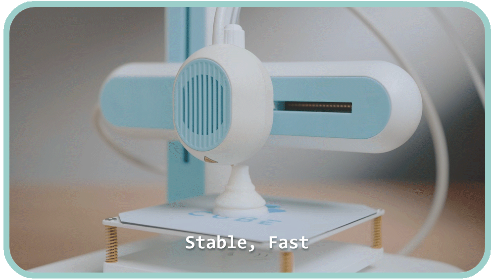 かわいらしい姿をいい意味で裏切るのがGoofoo Cubeです!Cubeは力強くで高速で稼働します。印刷物が出来上がるまで余計な時間を費やす必要はありません。Cubeアプリ上で印刷に必要な時間が確認でき、最短5分での印刷も可能です。あなたのアイデアを素早く、安定した方法で実現しましょう。