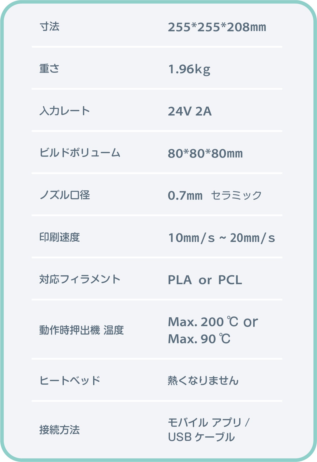 鋭角な部分を無くし、丸みを帯びたかわいいフォルムと、挟み込みによる怪我を防止するため、機械的な部分を露出させない機構設計を採用しています。この安全設計も、あなたとお子さんが3Dプリントという新しく未知の世界を体験するためにオススメしたいイントです。