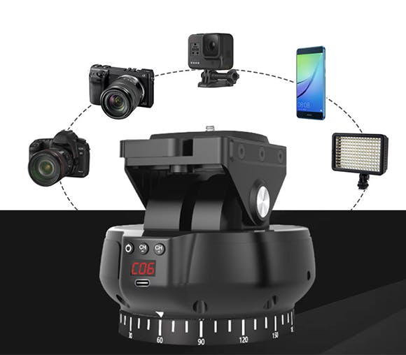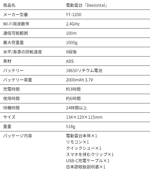 電動雲台のサイズはコンパクト(134×129×115mm)で、重量もわずか518gの軽量です。カメラバッグに入れて手軽に持ち運べます。