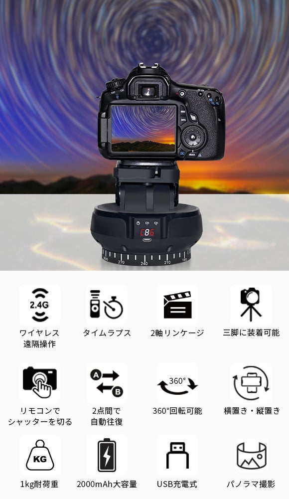 横軸と縦軸の動く方向、速度を設定して(1つの軸だけ移動することも可能)、対象物を様々な角度から自由に構図できます。