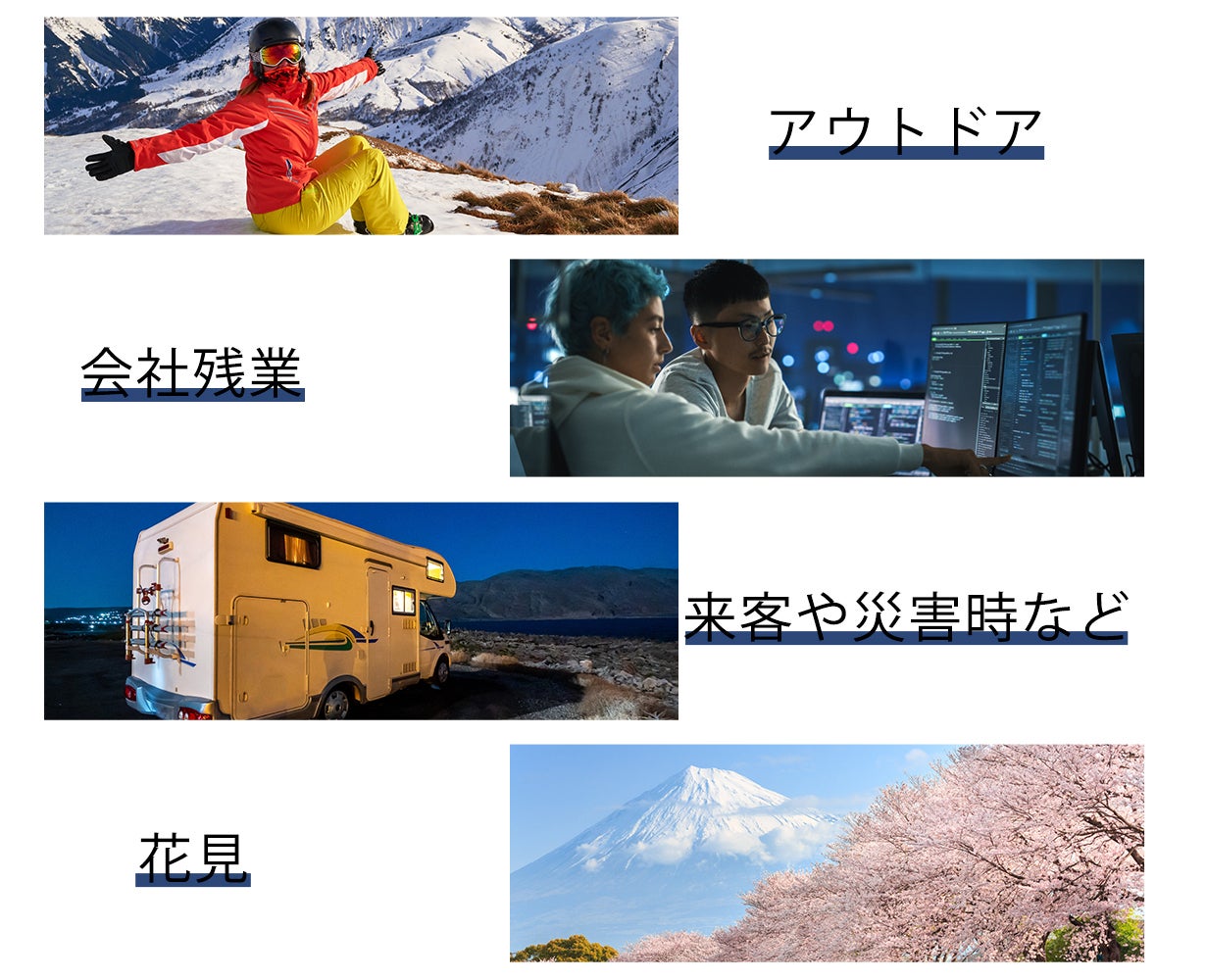 キャンプ、BBQ、車、登山、アウトドア、天体観測、ツーリング、花見、会社の残業、災害時など様々な場面で大活躍!