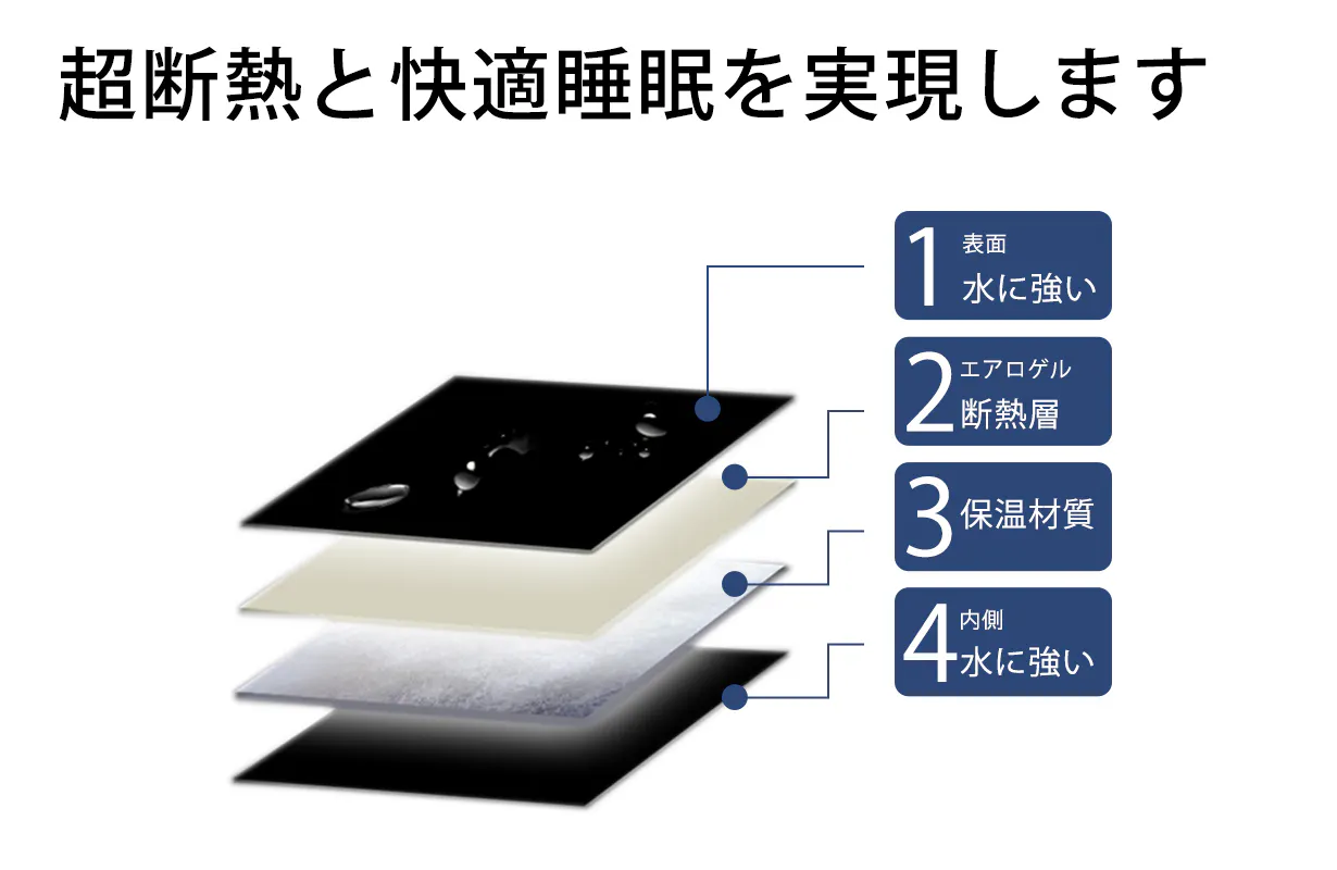 ①防風、防水、汚れに強く、風や寒気を遮断し、冷えることなく快適に過ごせ、ふんわりとした安心の寝心地を実現してくれます。