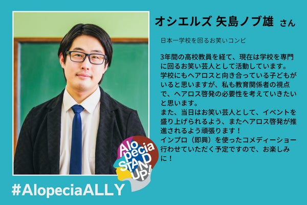司会進行をしてくださるのは、これからブレイクする事間違いなしのお笑いコンビ、オシエルズの矢島さん。なんと現役教員でもあるんですよ。即興ライブも予定しています。お楽しみに♪♪