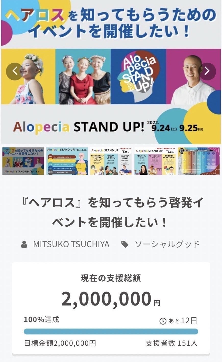 何よりも嬉しいのは、約150名もの大勢の方に『ヘアロスの認知を広げたい』『一人で悩んでいる当事者に、良質な情報を届けたい』というわたし達の想いに賛同していただけたことです。ご支援くださる方には、当事者の方も沢山いらっしゃいます。同時に当事者ではないけれど、わたし達を応援したいと、ご支援下さった方も大勢いらっしゃいました。