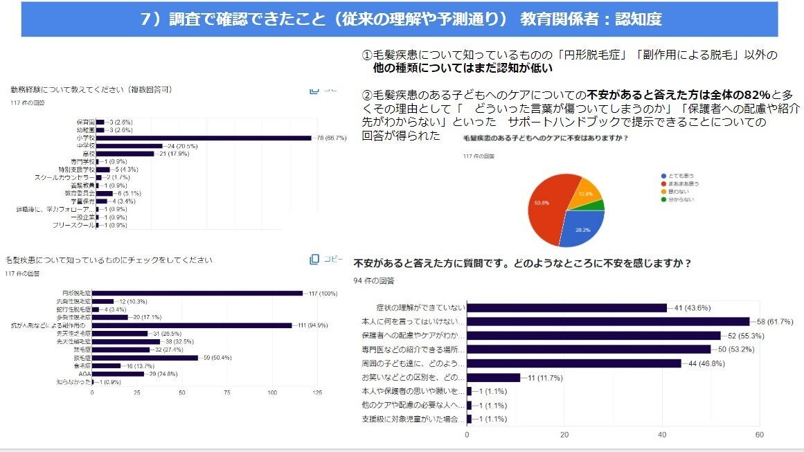 2023年に向けて、円形脱毛症のお子様の保護者様、教育関係者の方にアンケートを実施しました。予想はしていたもののやはり、髪がなくなる症状自体が知られていないことがわかります。