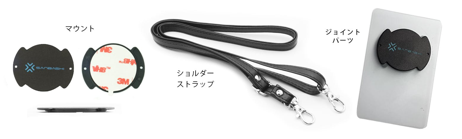・マウント(スマホ取付用パーツ)☓2・ジョイントパーツ(財布とカードケース取付用パーツ)☓1・ショルダーストラップ(ブラック)☓1※合皮素材の財布には合皮のショルダーストラップ、牛皮の財布には牛皮のストラップ