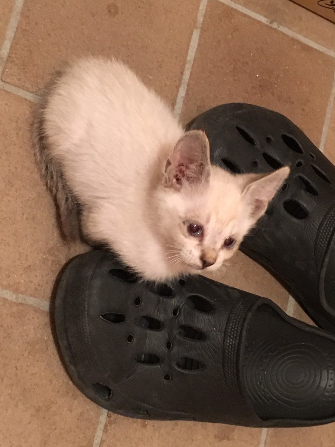 次に保護したのは、シャム猫のような子でした。この子は道路の隅でうずくまっていたのを保護しました。保護当時は猫風邪が酷く、ノミも目で確認できるほど表面にびっしりついており、完治するのに2週間程かかりました。獣医さん曰く、この子は体力がない為、母親に捨てられたのだと、自然界では弱い個体は捨てられるか食われてしまうのだと、自然の摂理なので仕方がないことですが、大事に至る前に保護できて良かったと心から思った子です。ちなみにこの子は里親さんが見つかり、1週間のトライアルを経て無事に譲渡することができました。