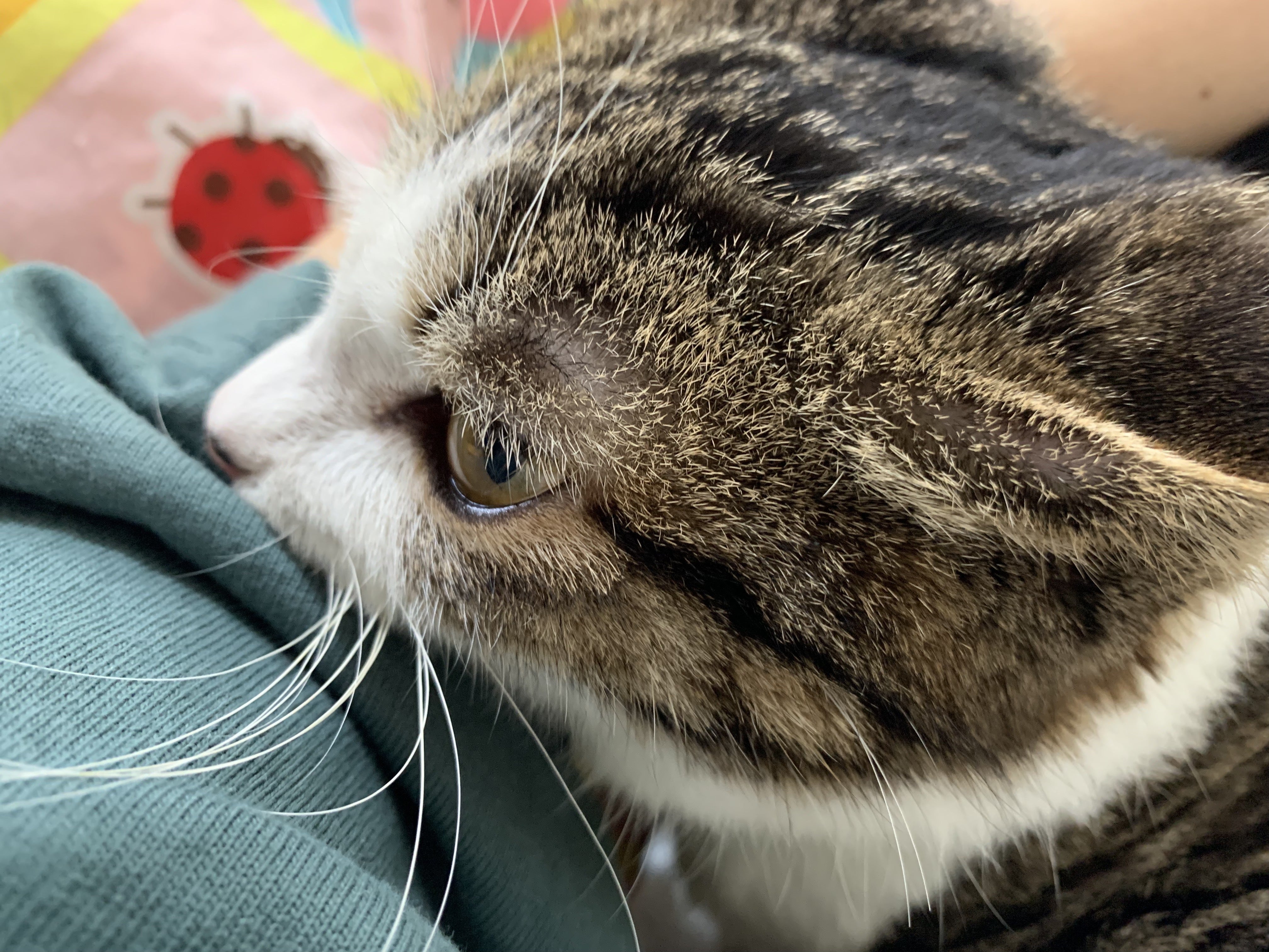 私はそれまで、猫を家族に迎えた事がなかったのでこの子の目が青いのを見て、「この子は何か特別な子なんだ!」と勘違いし、目が青い=「あおくん」と安直に名前を付けてしまった印象深い子です。保護当時は生後1ヶ月程で健康状態にも特に問題なく、元気いっぱいなまま今年の10月で1歳を迎える我が家に1番長いこといる猫です。