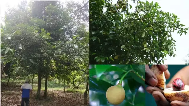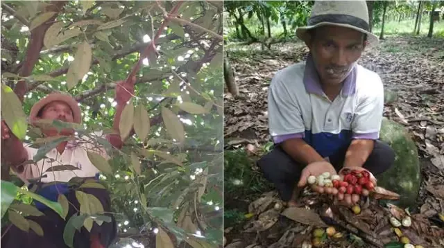 7~8年くらいかけて栽培したニクズクの木から、ナツメグの実を収穫しています。