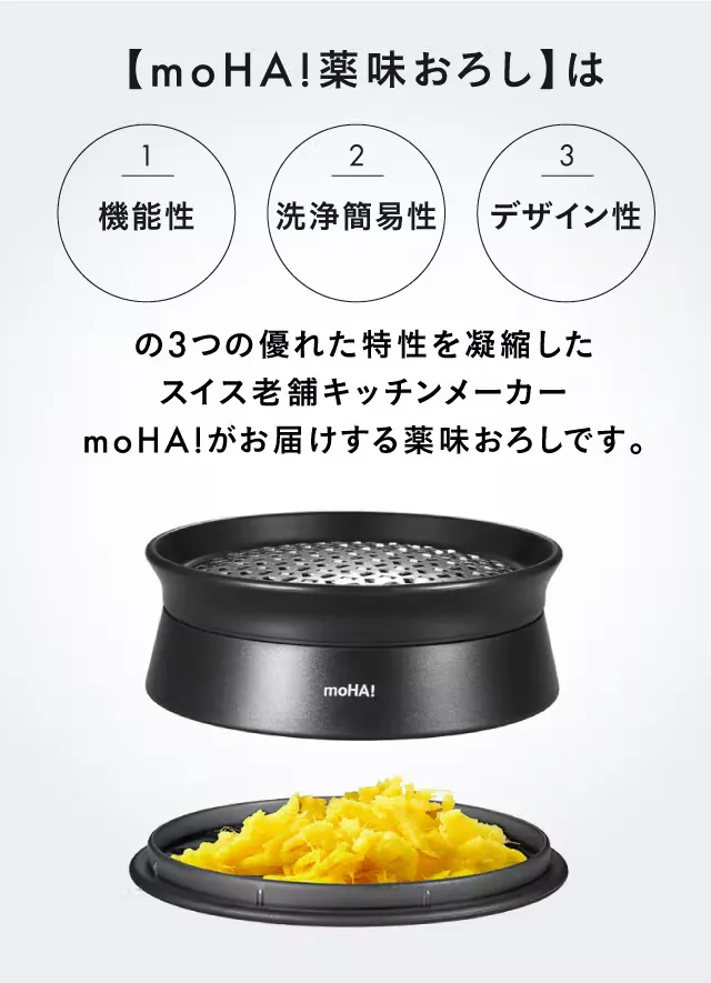 ヨーロッパ市場のみならず、全世界へさまざまなキッチングッズを送り出してきたmoHA!におけるさまざまなキッチン用品のノウハウと、顧客からのフィードバックを得て開発された、moHA!薬味おろしのご案内です。