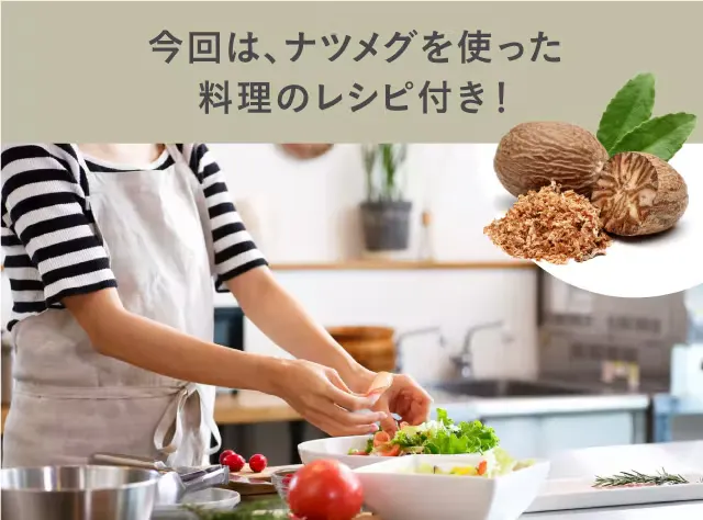 ナツメグの甘くてスパイシーな香りは、肉の臭み消しに有効。ハンバーグや肉料理、スパイス入りのケーキやクッキー、ドリンクなどさまざまに利用されます。また、乳製品の臭み消しにも有効で、牛乳やチーズも相性抜群です。