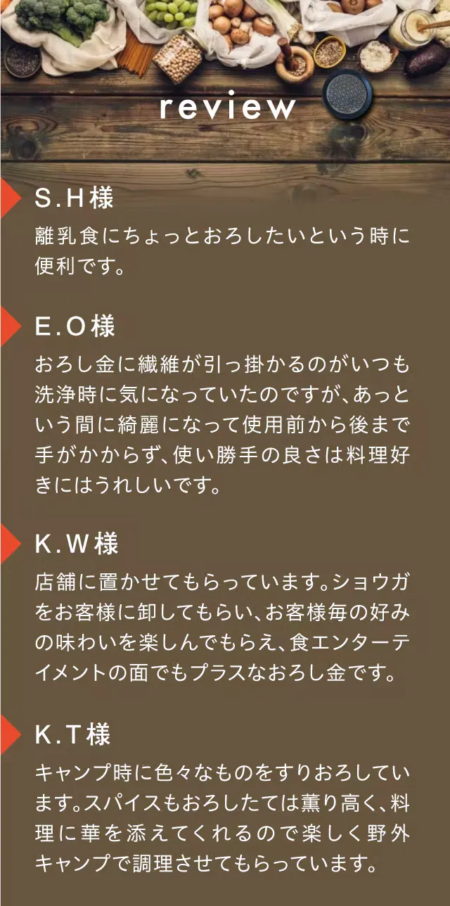 使用中にぬぐい取ることでおろし金に残る薬味が激減するため、洗浄もストレスレスです。