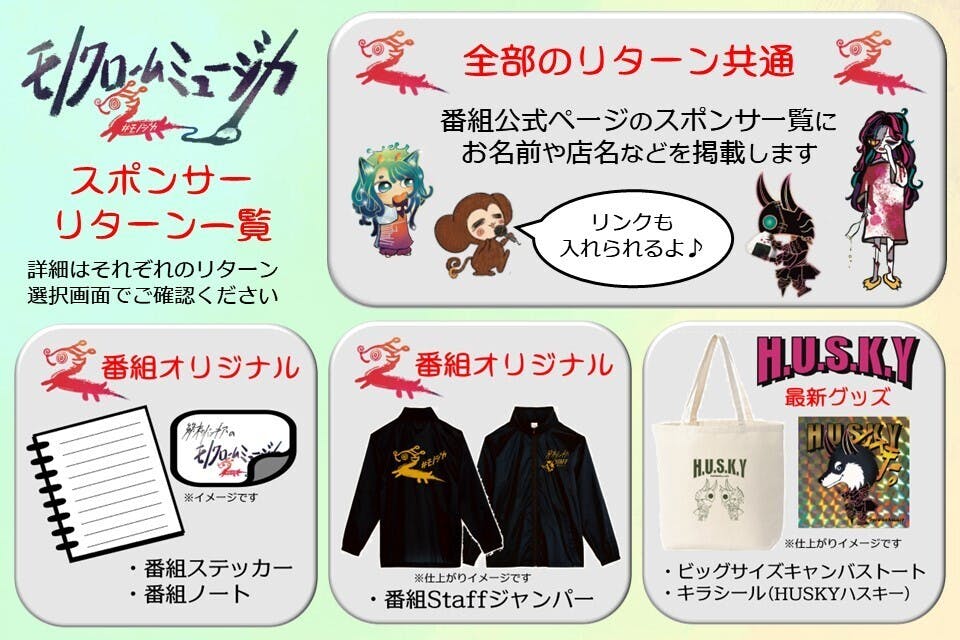 すべてのリターン共通で、番組公式ページの「番組スポンサー一覧」に、ご希望のお名前(ニックネーム、店名、企業名、個人名など)を掲載させていただきます。お店や企業などでロゴをお持ちの方は、そちらを掲載することも可能です。