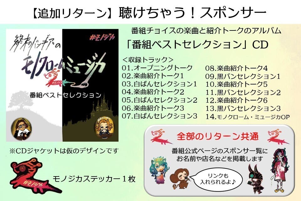 さて、昨夜発表させていただいた追加リターンのなかから「聴けちゃう!スポンサー」のリターン品「番組ベストセレクション」CDのご紹介です。