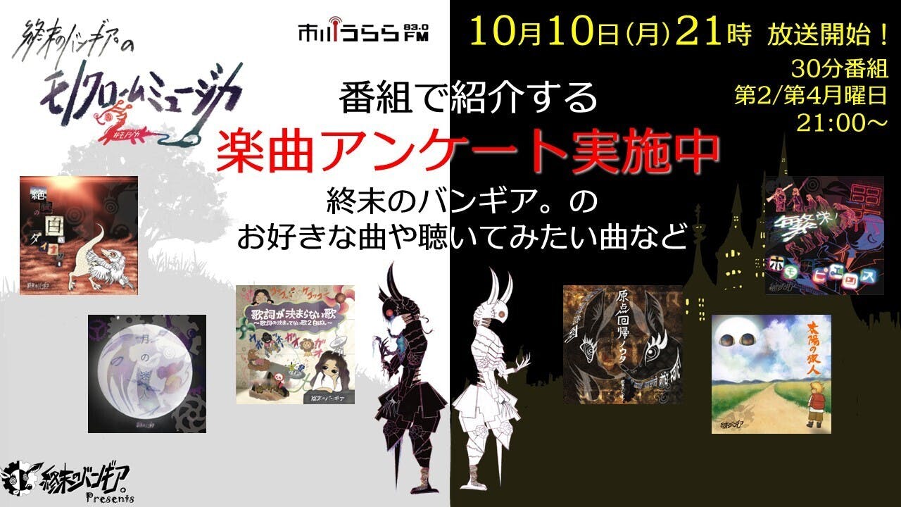 番組では10月より12月までに「バンギアのコーナー」で紹介する楽曲のアンケートを実施ています。アンケートの集計結果をもとに、白ばんの歌3曲、黒バンの歌3曲を決定し、番組で紹介したいと思っております。