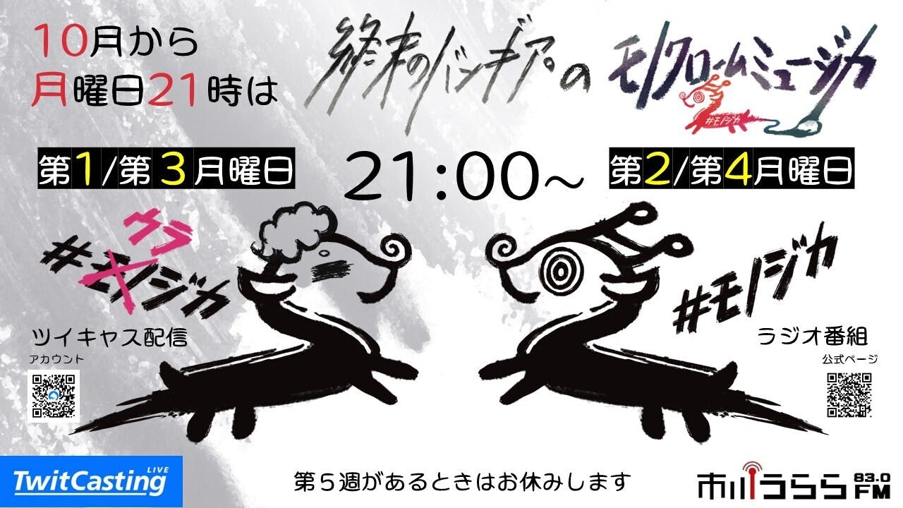 「モノクローム・ミュージカ」のラジオは毎月第2・第4月曜日21時からの放送ですが、第1・第3の月曜日はツイキャスで「裏モノジカ」略して「ウラジカ」をライブ配信いたします!