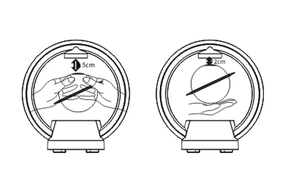 ③上部の中心点から5cmのところにボールを持ち、上部の中心点にゆっくりと垂直に上向きに近づきます。上から約2cmのところに力を感じてボールを安定して保持できるので、ゆっくりとスピーカーから手を離します。