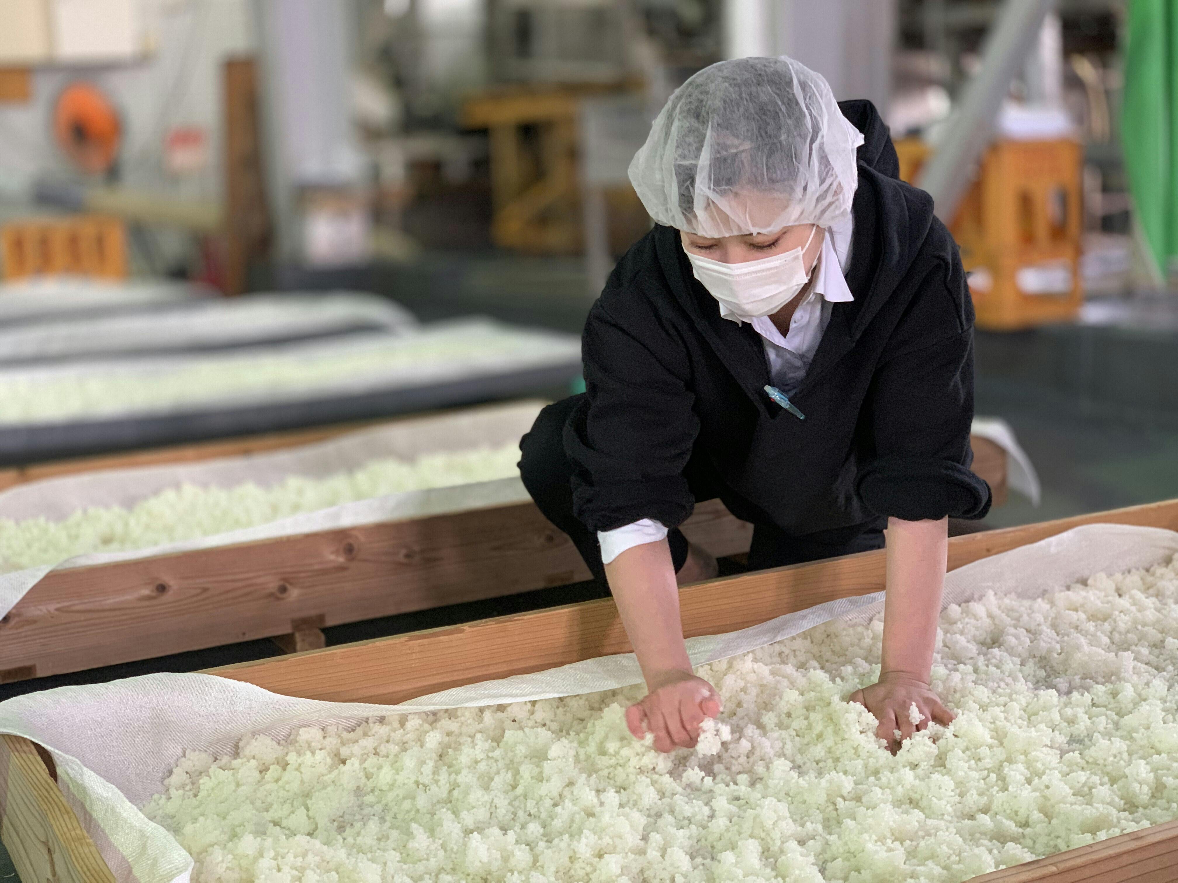 熱々のお米を手作業で広げます!