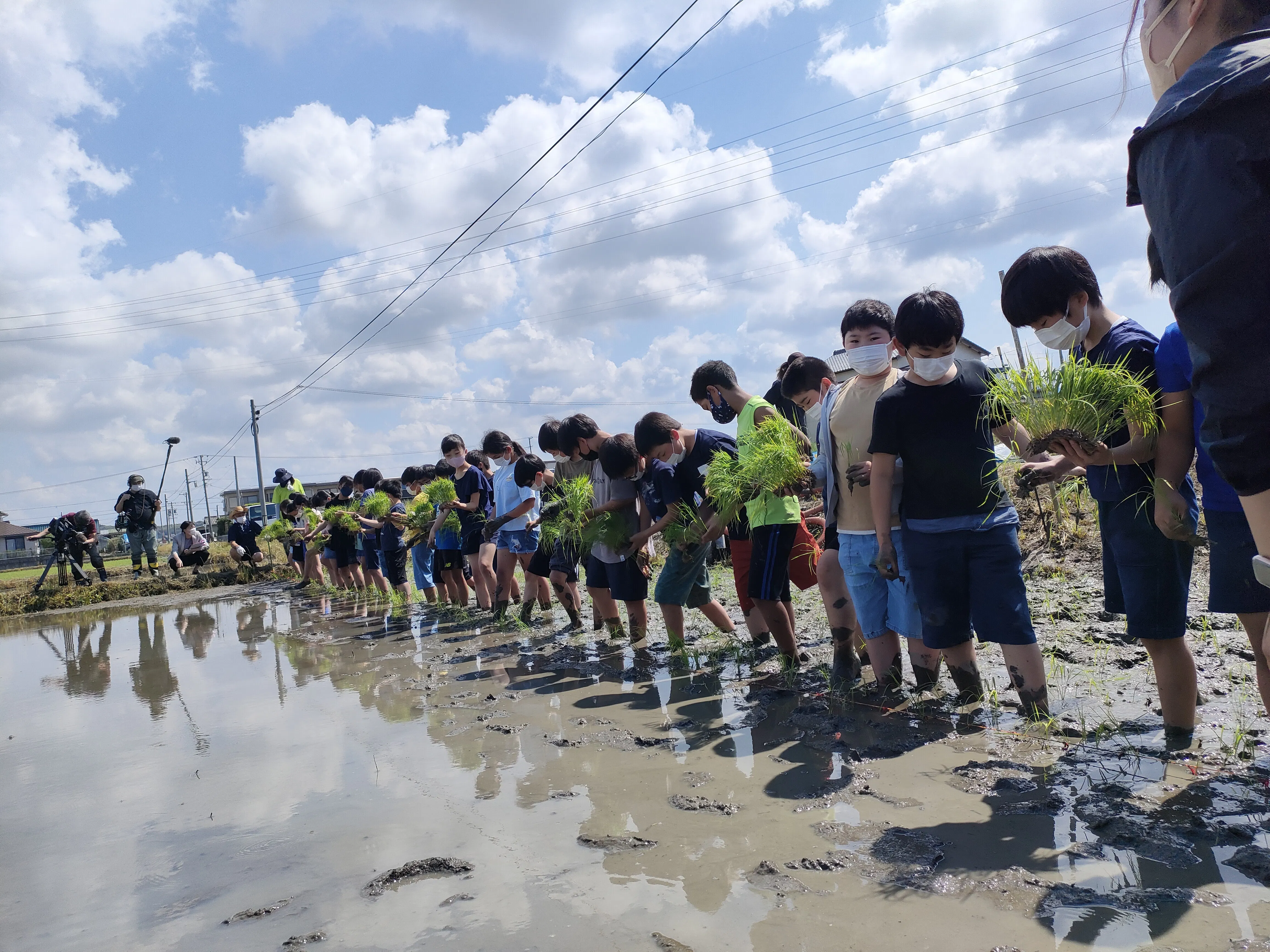 山田錦を育てている田んぼの近くの小学校の児童さんたちには、実際の山田錦の田植えを一緒に行って頂きました。事前の説明会でSDGsについて学んだ児童さんたちはとても真剣な表情で田植えを行ってくれていました。
