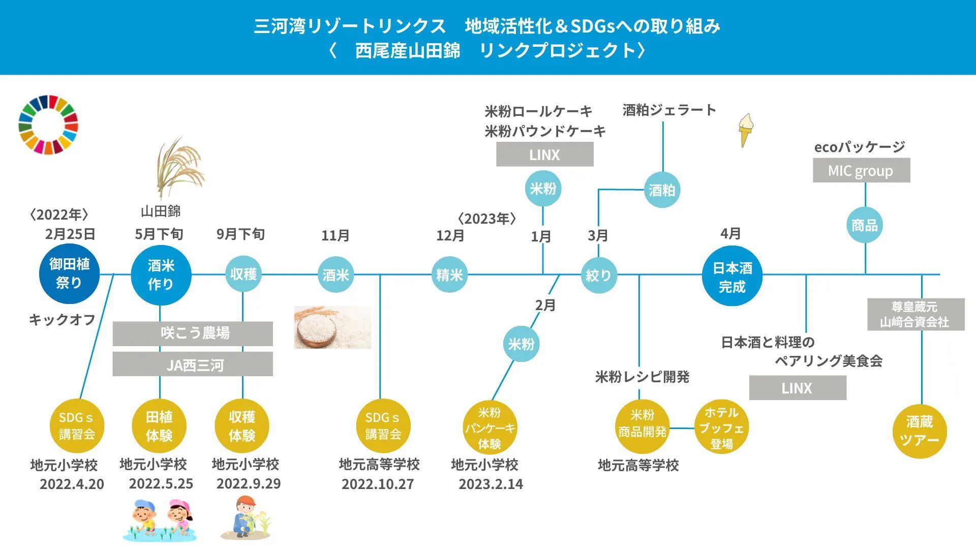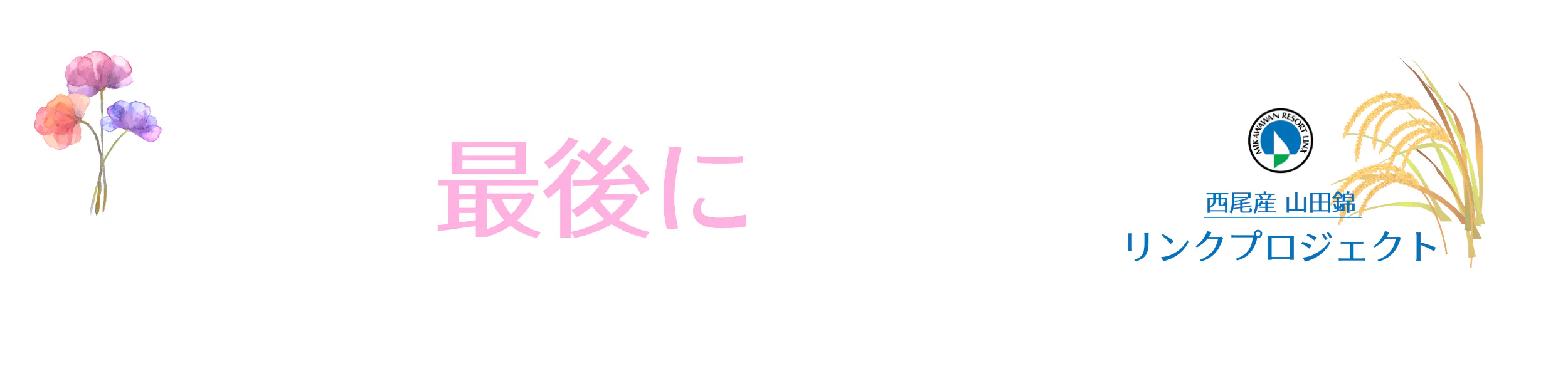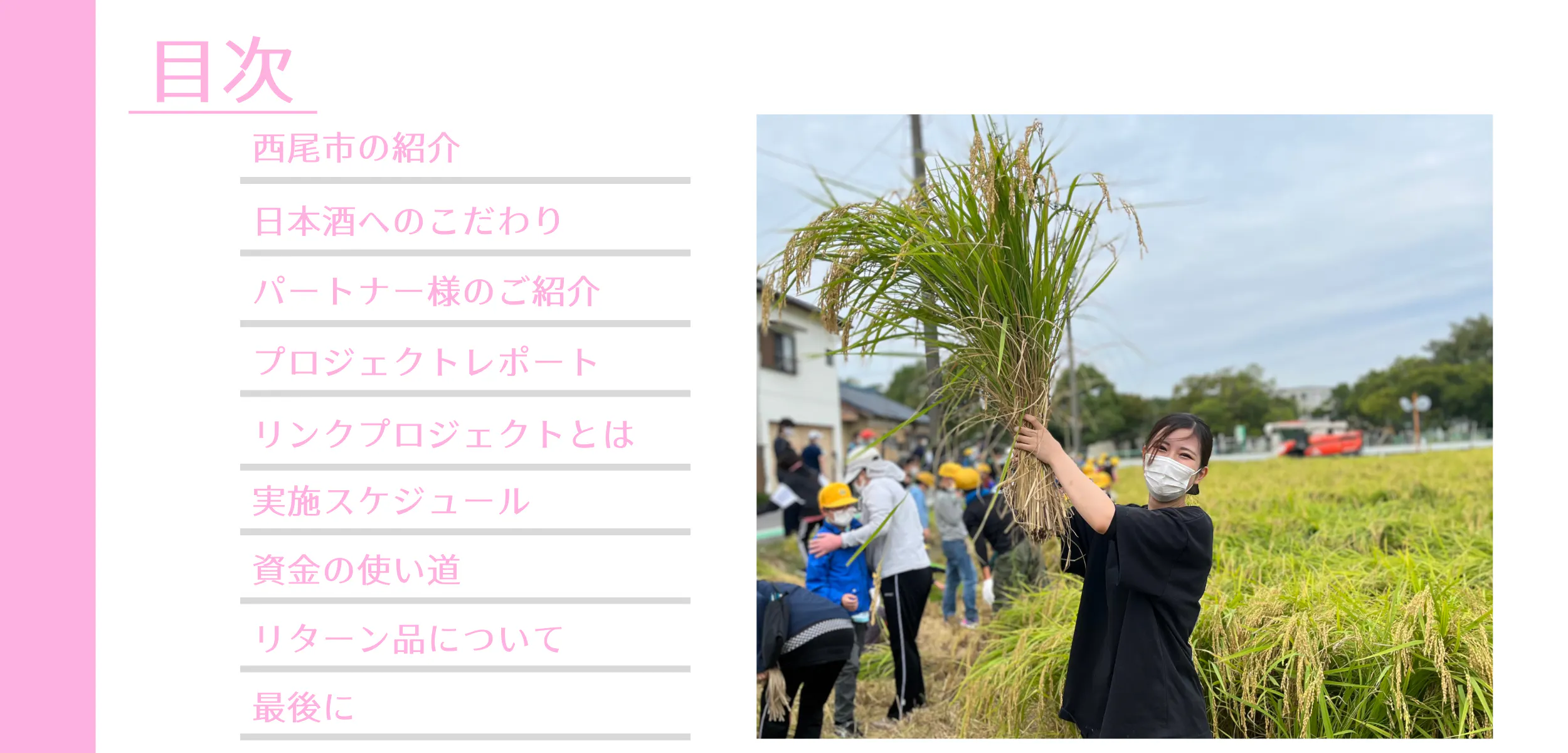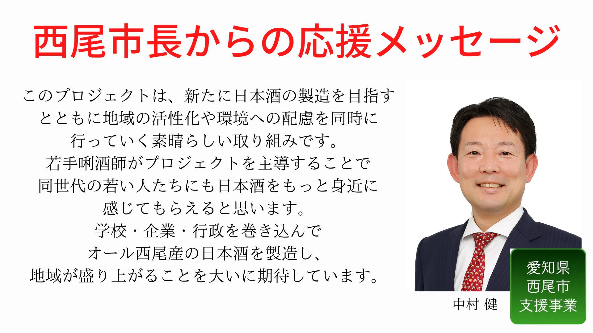 リンクプロジェクトとは、地元の企業・団体と連携しながら、地産地消で新しいモノを造り、地域の活性化を目指すプロジェクトです。今回の日本酒造りもその一環。酒米作りまでをオール西尾にこだわって取り組んでまいります。