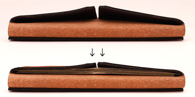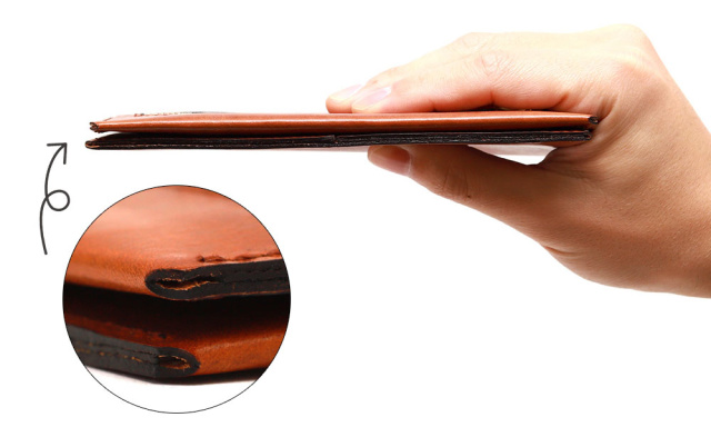 両脇を縫わずに革を折るように仕上げる事で、横幅を減らす事に成功しています。