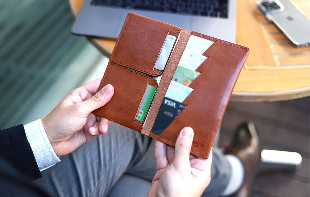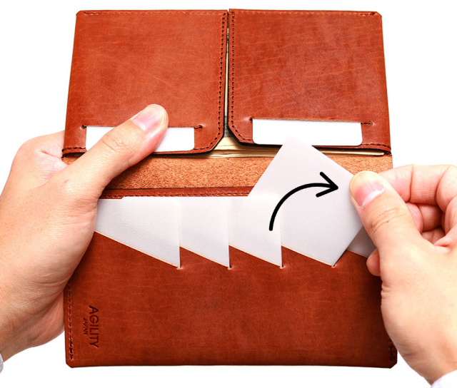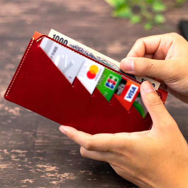 カードは革に入れたスリットで収納します。
