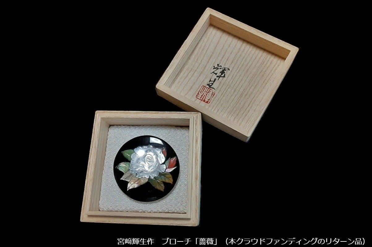 今回のクラウドファンディングのために宮﨑氏が制作しました。白蝶貝を彫刻してつくった花弁は「裏彩色」の技法により、ごく薄いピンク色がほんのり入っています。葉はあわび貝や着色した牙角、つぼみは堆朱…、と複数の材料を取り合わせ、呂色漆を施した素地に芝山象嵌の技法で彫り込みました。裏面は細かく切った夜光貝を蒔いて研ぎ出し、蒔絵で「輝生」と入れました。ブローチ、名刺入れともに国産漆を使用しています。