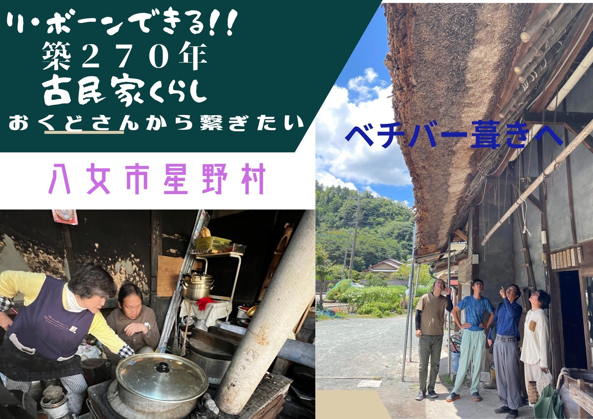 福岡県八女市星野村。江戸時代中期から続く築270年の茅葺古民家があります。自然と共鳴しながら暮らす里山暮らしの、お金では買えない豊かさを体感し、「人生をリ・ボーンする体験」を多くの人に届けたいという想いで、星野村で最後の一軒となった茅葺古民家の修復のためにクラウドファンディングに挑戦します。