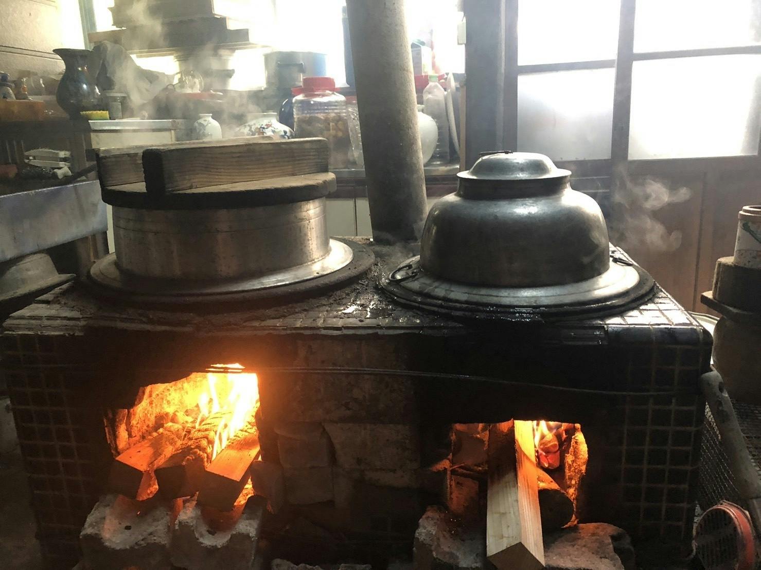 羽釜は日本昔ばなしに出てきそうなシーンですよね。焚き物のいい匂いとススになった天井や壁がとても落ち着きます。