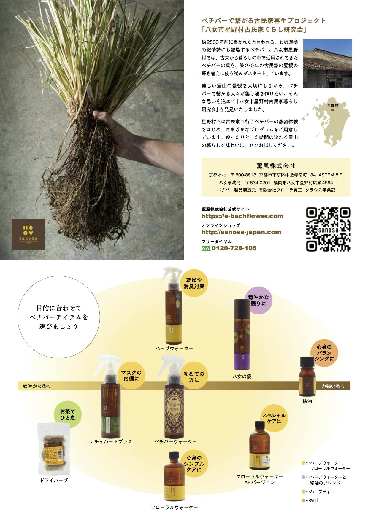2023/08/27 16:41福岡県八女市星野村・星野村とベチバー・ベチバーに導かれて...・作り手と創る人を繋ぐ 国産ベチバーブランド 「SAnoSA」星野村とベチバー 築約270年の茅・杉皮葺き 福岡県八女市星野村に、八女茶の伝統玉露を作り続けてきた古民家があります。270年前のその当時のままに暮らす高木家。茅葺きに杉の皮を葺いている屋根は日本古来の里の姿を残し、訪れる人々の心を和ませ、魅了しています。ところが、6年前に九州北部豪雨(2012年)が発生。代々伝わる古木のお茶の木も流され、土地の土は変わり果て、農家にとって存続するのは困難なことが多く皆が途方にくれました。当時、有限会社フローラ美工・専務だった弟の渡辺裕一朗は、学生の頃に居候していた高木家の役に立ちたいという想いから、その当時インドネシアから輸入されたベチバーで、両親が作る天然消臭剤の資材のハーブを植えます。 和多屋嘉平商店 渡邉 裕一朗そのハーブが土壌流出を止めるために、海外や沖縄で役に立っていることを知ったのです。ハーブに詳しい専門家を探し、星野村へ招いて越冬という課題に取組み、翌春には見事クリアするに至りました。そこから星野川の河川敷、休耕田、火山灰、砂地、海岸・・・植栽と観察を行い、実験が始まりました。(現況:未だベチバーの土留は事業として実現しておらずボータレスの皆様とも関わって頂きながらボランティアで水俣に施策をしている段階です。現職はボリビアからのアンデス岩塩の卸業など)本当の水の循環を取り戻し治水をする決め手となると信じて止まない想いはいつ実現するのでしょうか。私たちにも分からないけど必要だとは確信しています。)ベチバーに導かれて... 星野村の風景元々ベチバーは原産が南インドの常夏の地域に作られています。精油となり、有名ブランドの高級香水のベースノートにもなっている縁の下の力持ち的存在。類を見ない独特の希少な役割を果たしています。私は当時、愛知県で3人の男の子の子育ての合間にセラピストとして、ハーブやバッチフワラーのコンサルテーションなどの植物療法の相談を受けていました。度々、出張の折に愛知に立ち寄る弟に「八女に、蒸留水の責任者として帰って来て欲しい」という相談を持ちかけられていたのです。その都度、身の回りの整理がつかずに悩んでいましたが、今考えるとその頃自分に起きたことは、まるで八女に帰るように仕向けられた脚本の一部だったような気がします。結局、紆余曲折ありながら次男と三男を連れて八女へ戻る決心をします。そして長男と主人は愛知に残ることになったのです。それから九大との研究が始まり、ベチバーの歴史、特徴、様々な民族文化としての在り方などを学び、専門家のお話しをお聞きし、ベチバー精油の最上級と言われるベチバーブルボンの蒸留を見にレ・ユニオン島に行ったり、マーケティングとしての可能性を調査するため香港を訪問するなど、色んな方々のお力添えを頂きながら、まだまだ未知のベチバーの情報収集と開発に勤しんでいます。大学や食品センターの研究結果を基に蒸留水を造り出し、その後3年間、試行錯誤の毎日となりました。 レ・ユニオン島のベチバーブレンドの魔術師といわれるほどの「鎮静の香り」をもったハーブとして 、南インドの家庭医学で用いられる妙薬として、アーユルヴェーダの薬草として、インドのお寺の屋根を葺く資材として、王宮の涼をとる網戸や団扇として、モスリンと呼ばれる布を守る忌避剤として、野菜の防腐剤として、病中病後の滋養のお茶として。それに、肌のお手入れ、浄血や頭に良いと書物に残され、2500年前のお釈迦様の叙情詩にも記載がある、香草。その香りを求める人は今も昔も数多く、特に国産の香りには、独特の土臭さが無く、芳しく品があり優しい仕上がりのため、多くの専門家やセラピストを驚かせ、魅了しています。作り手と創る人を繋ぐ 国産ベチバーブランド 「SAnoSA」 星野村の自然栽培 ベチバー現在(2018年)、福岡県では自然農法を、3年前から熊本県ではバイオダイナミック農法を、自社管理のもと行なっています。植栽から収穫、水蒸気蒸留、充填までを一貫して管理し弟がネーミングした《里の作法》SAnoSAを引き継ぎ、作る手《生産》と創る人《加工者》を繋ぐという意味を併せて「SAnoSA」ブランドとし、国産ベチバーを広く必要な方へ届けることに尽力する日々です。異常気象、公害、災害、汚染されてゆくストレス社会で苦しむ人々にとって、自然のままのハーブウォーターという植物の力そのものを日常に取り入れることが、どれほど救いになるのかということを先人たちは知っていました。私どもの薫風株式会社は、有限会社フローラ美工のベチバーそのものを活かした製品を皆さんにお届けしています。生命の知恵として、ホリスティックケアとして、安心な場作りをしながら、講座でお伝えするイドロラセラピーもその一つです。これからの社会に役立ち、