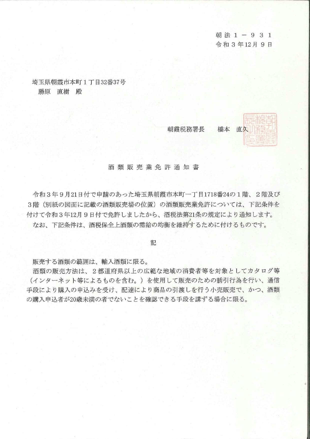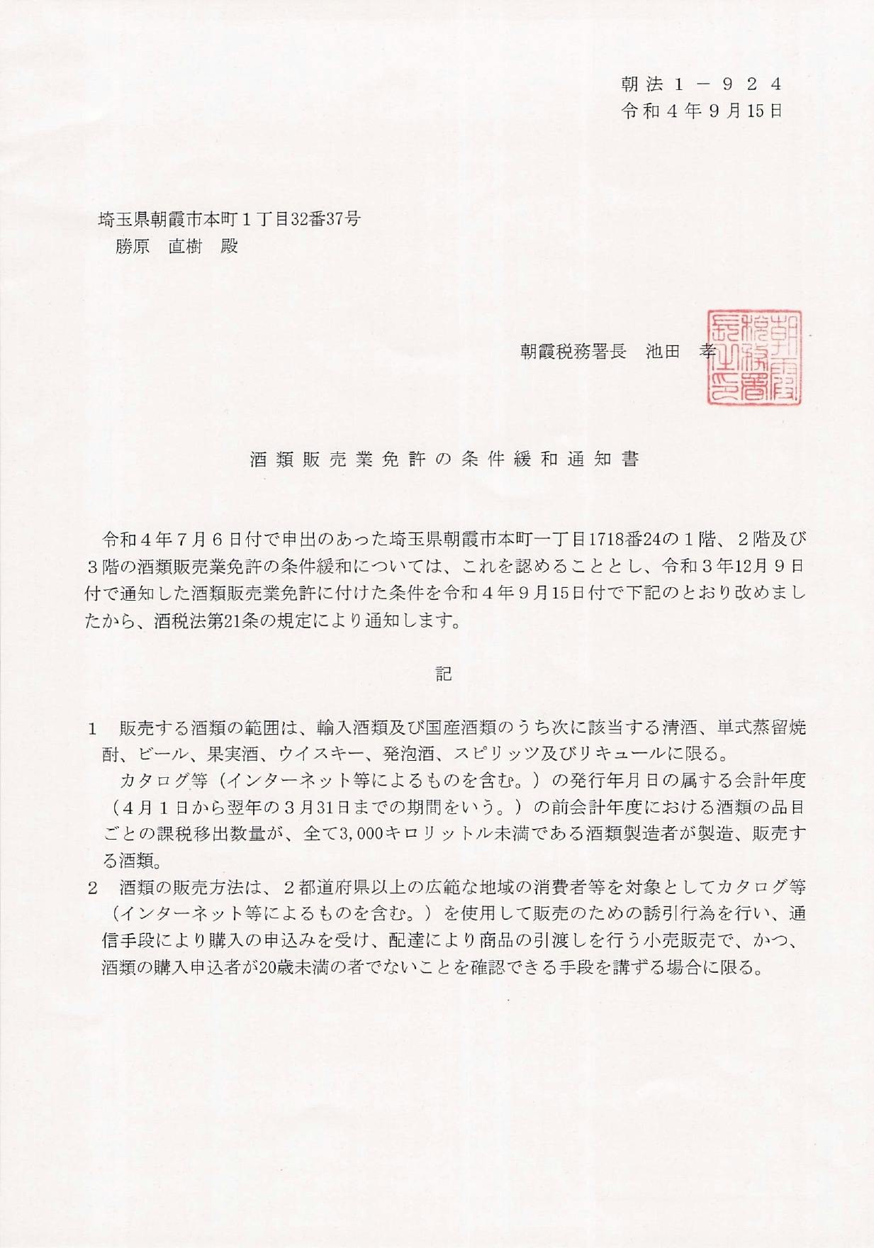 酒類販売免許の条件緩和、無事に審査が通りました。