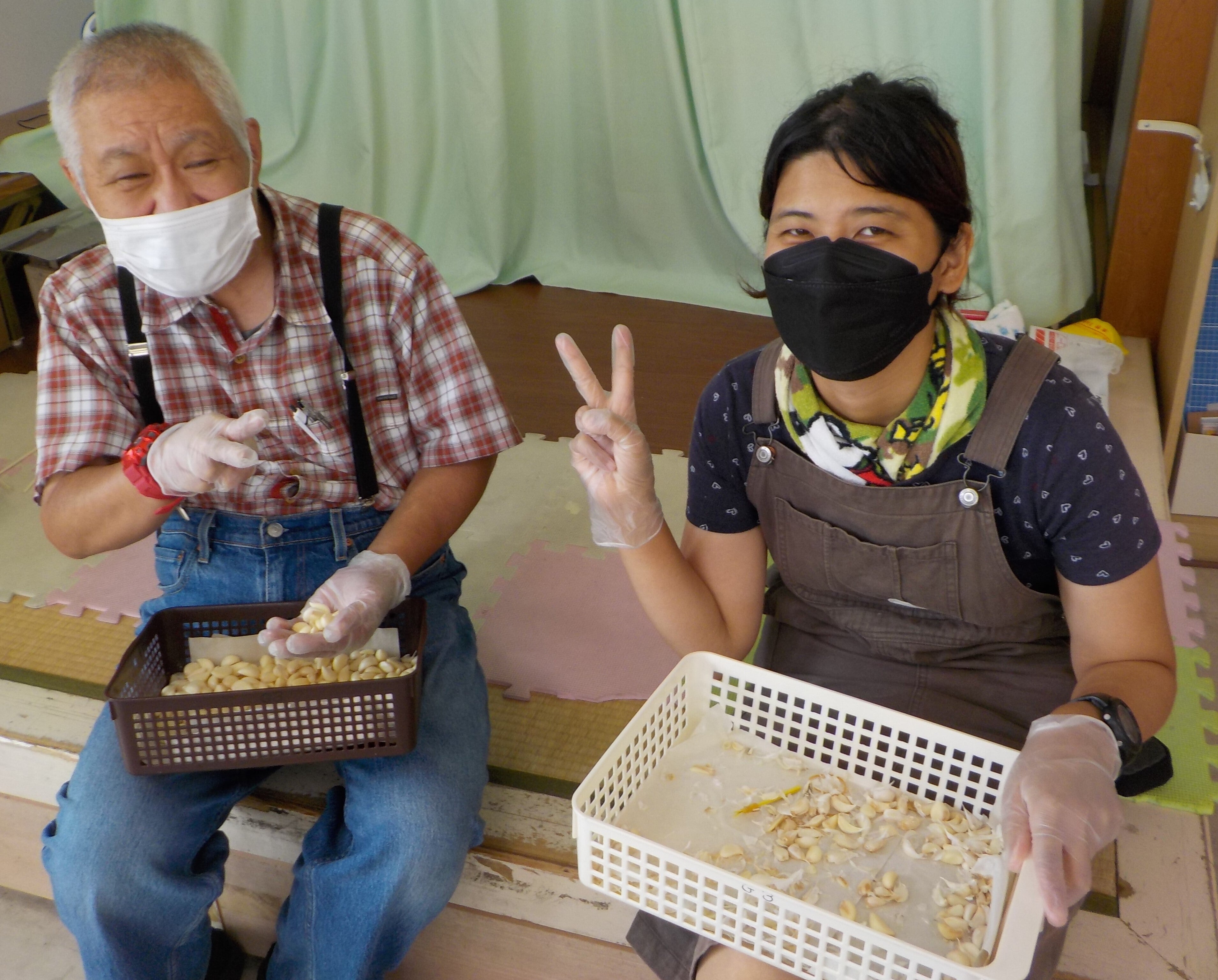 収穫したニンニクは、一つ一つ丁寧に皮むきします。薄皮も傷をつけずにむくのは、とても大変な作業なのですが、みなさんで力を合わせて20kgのニンニクの皮むきを完成できました。