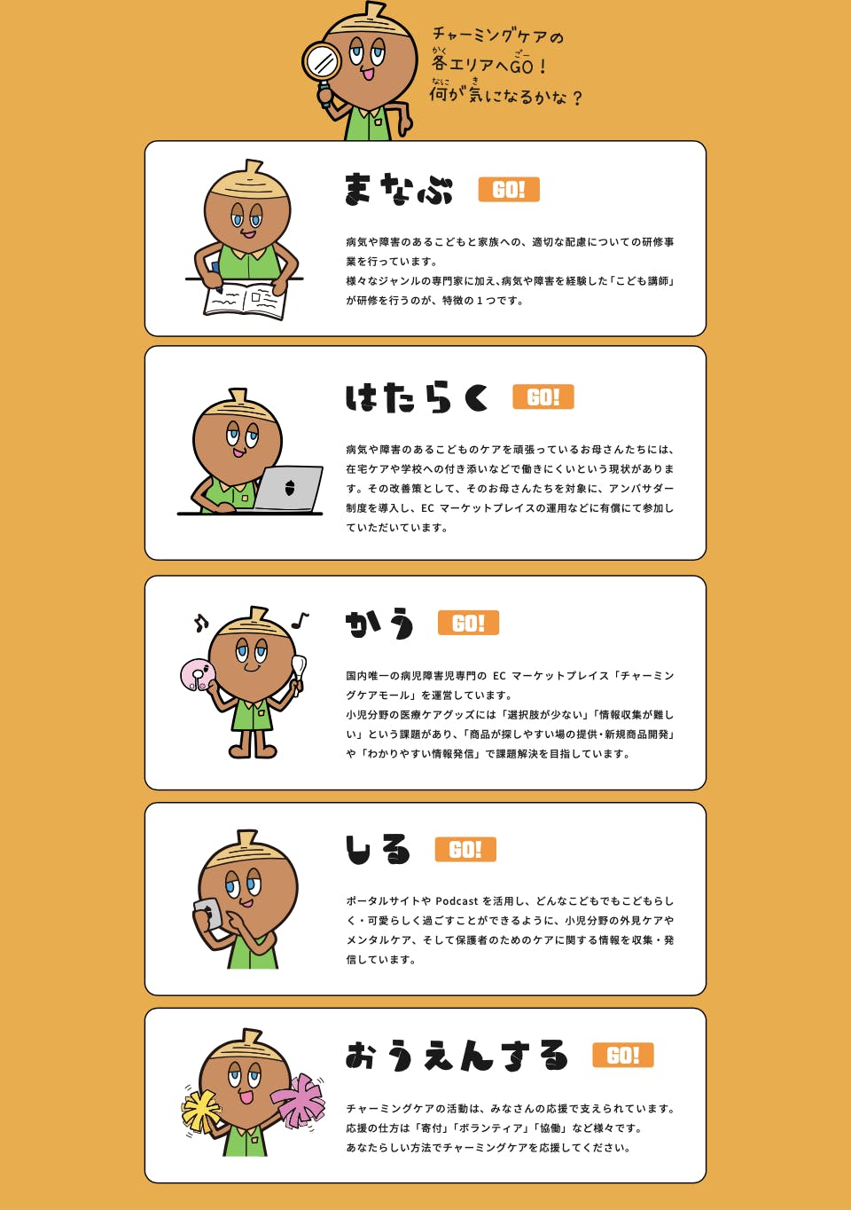●ポータルサイトやPodcastを活用し、どんな子どもでも子どもらしく・可愛らしく過ごすことができるように、小児分野の外見ケアやメンタルケア、そして保護者のためのケアに関する情報を「まなぶ・はたらく・かう・しる・おうえんする」という5軸で展開し情報収集・発信しています。