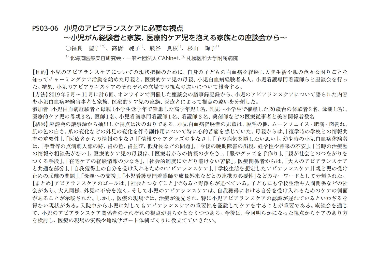 *2020年我々の起案により座談会を共同開催し、札幌医科大学附属病院・北海道医療美容研究会・一般社団法人 CAN net様より上記学会抄録発表をがんサポーティブ学会にて行なっていただきました。