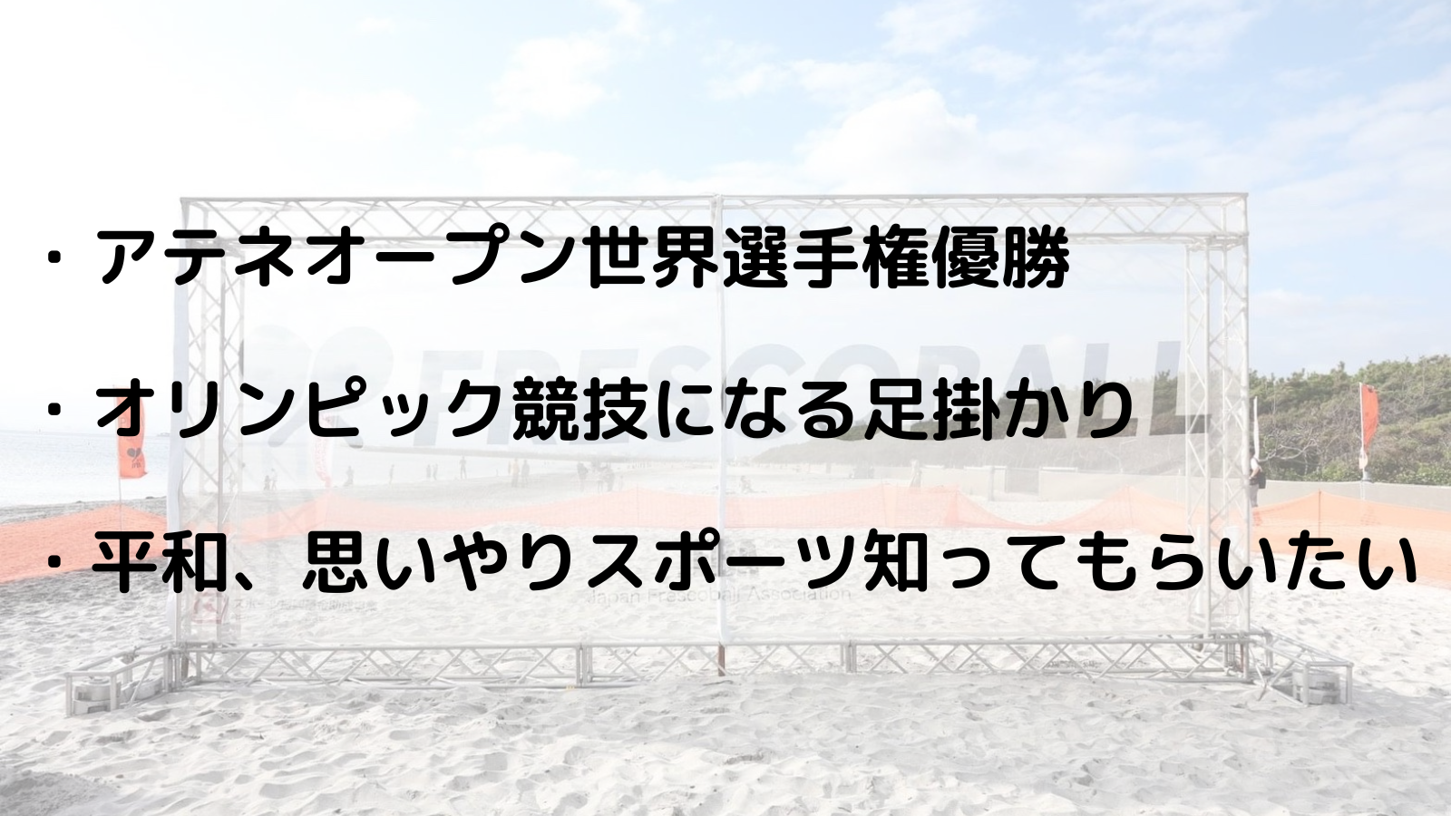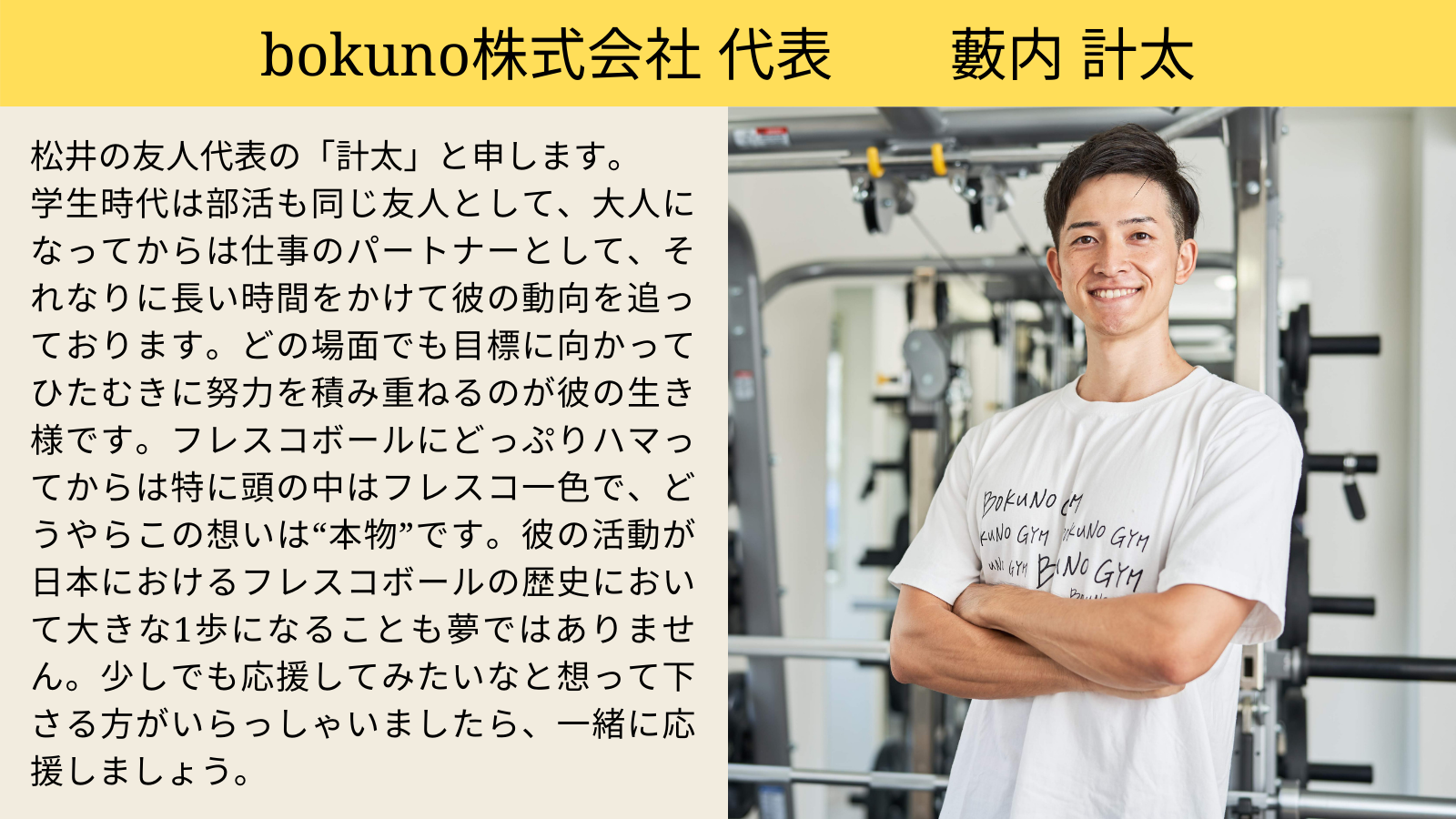 本プロジェクト無事終了いたしました。 たくさんご支援いただきありがとうございます。 リターン順次ご用意いたします。お待ちくださいませ。 支援者の皆様あっての今回のクラウドファンディングでございます。 重ねまして皆様に熱く厚く御礼申し上げます。 引き続き皆様からのご声援いただけると幸いです。 フレスコボール日本代表 松井芳寛 岸田直也