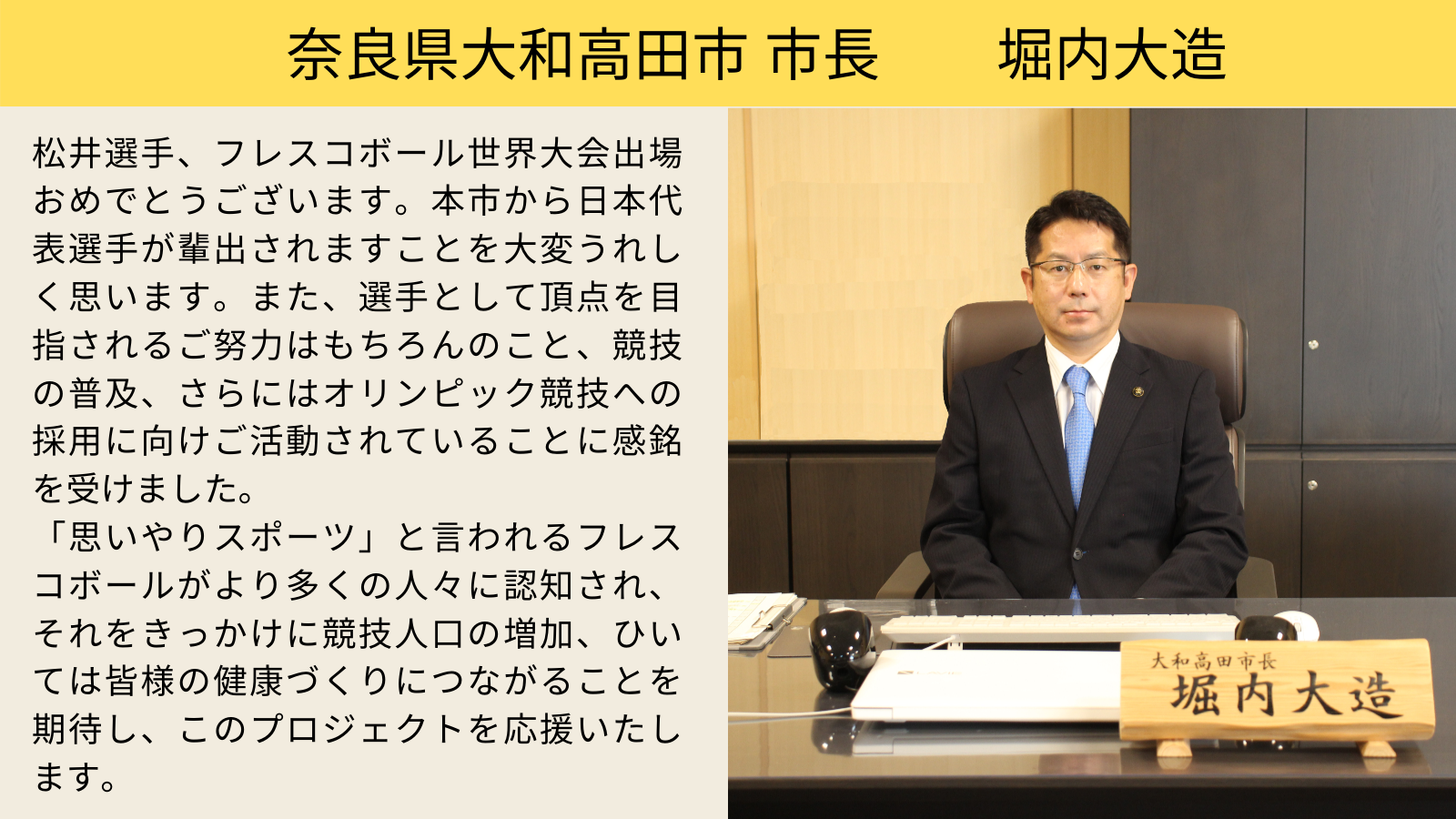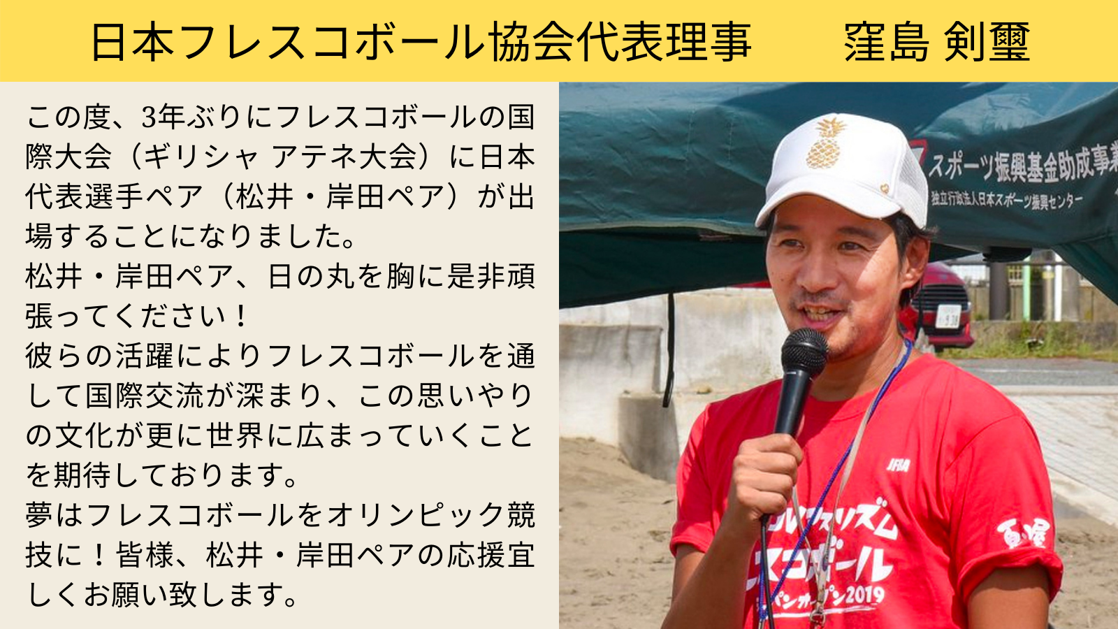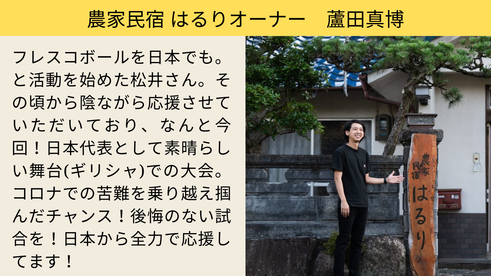 本来、日本代表選出されることで2021年末にフレスコボールの本場ブラジルにて大会参加ができる予定であったがコロナ禍により不参加が余儀なくされた。