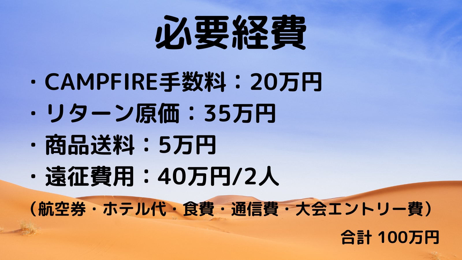 2022/08/27 07:11おはようございますプロジェクトオーナー松井です。クラファン残り1日となりました。皆様のご支援ございましてネクストゴールも達成することが出来ました。こちらから私たちの目標や想いをたくさんお伝えさせていただいて受け取っていただきありがとうございます。思い残すことはございません。あとは練習練習練習、そして優勝という結果を出すことだと思います◎練習の状況はといいますととても良いです。最高速度のラリーが形になってきております。大きなご期待していただけると嬉しいです^ ^では準備して行ってまいります。 もっと見る