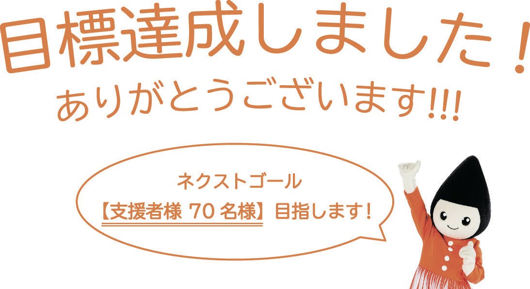 心より御礼申し上げます。ネクストゴールは弊社70周年とかけまして、【 支援者様70名様 】を目指して取り組んで参ります!!!
