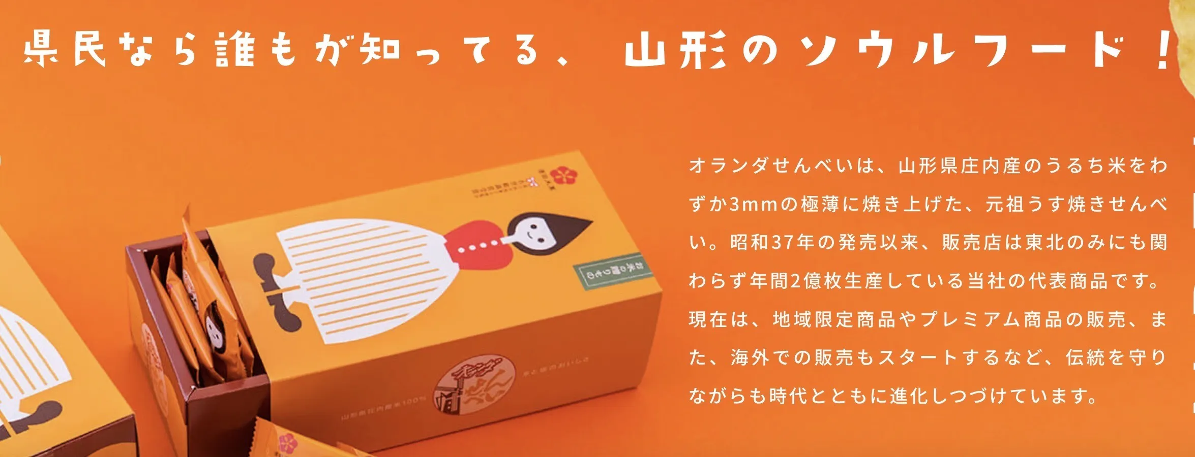 『酒田米菓』は、2021年に70周年を迎えました。製造しているオランダせんべいは「うるち米」を山形県庄内地域産のものにこだわり地域の農業や環境と共に歩んできました。