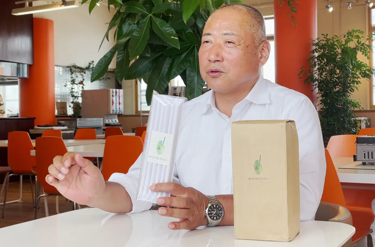 たまたま立ち寄ったカフェのストローをふと見ると、置いてあるストローが日本のようなプラスチックではなく、稲穂でできたストローでした。酒田米菓はお米を扱う会社なので、稲穂で作れるのならばもしかしたら米で作れるのではないか、、?と社長は考えました。