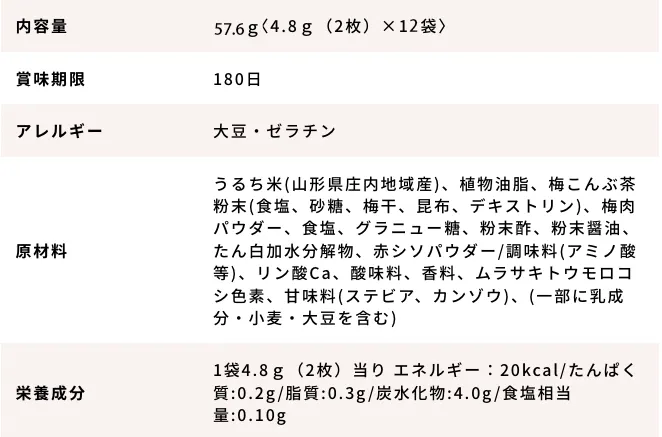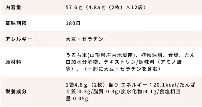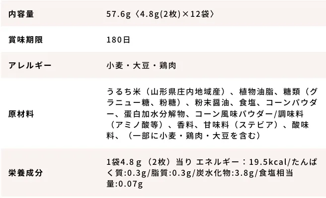 ・原材料 うるち米(山形県庄内地域産)、植物油脂、食塩、たん白加水分解物、デキストリン/調味料(アミノ酸等)、着色料(赤3、青1、黄4)、(一部に大豆・ゼラチンを含む)