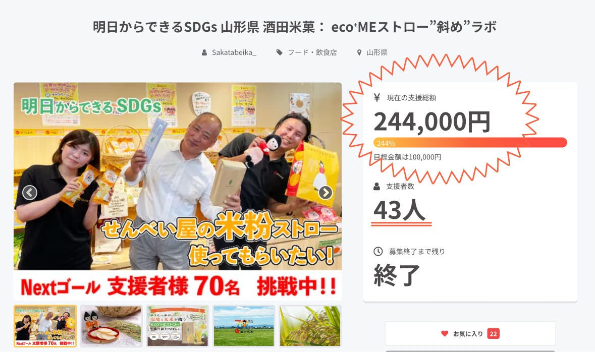 2022/08/29 11:05この度は「明日からできるSDGs 山形県酒田米菓: eco⁺MEストロー”斜め”ラボ」に沢山の皆様からご支援いただき、目標金額より【244%】越えを達成することができました!!誠にありがとうございます。初めての試みでしたので不安でいっぱいでしたが、皆様の温かいお言葉に励まして頂きここまですることができました。ご支援いただきました皆様のお陰です。これより順次リターンの発送を行ってまいりますので、今しばらくお待ちください。また、お届け先の住所変更したい方は下記メールアドレスにご連絡くださいませ。※今後のご連絡メールアドレスはこちらになります→【sakatabeika.official@gmail.com】日々の活動報告に関しましては、酒田米菓公式インスタグラム【@sakatabeika_official】にて投稿していきますのでご確認くださいませ! もっと見る