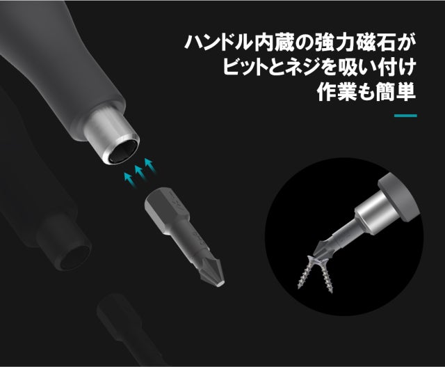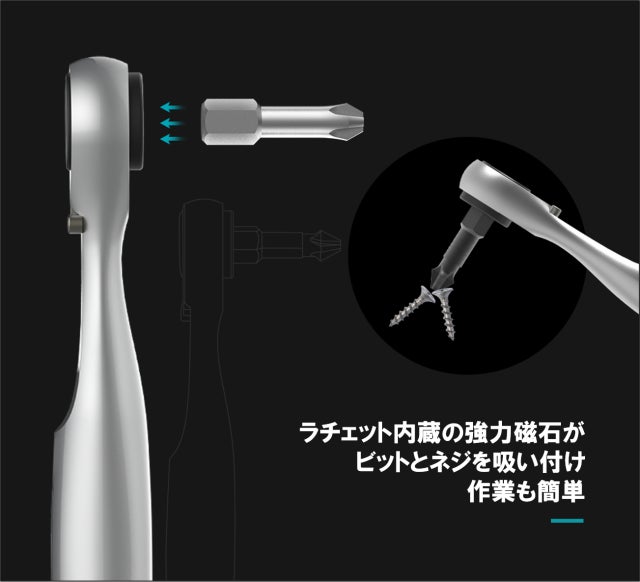 ドライバーハンドル、ラチェットレンチには磁石が内蔵されており、ビット交換時にカチッとビットを固定するため、ビットを落としてしまう心配が要りません!