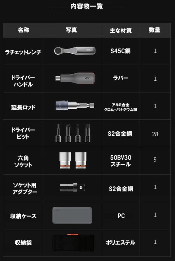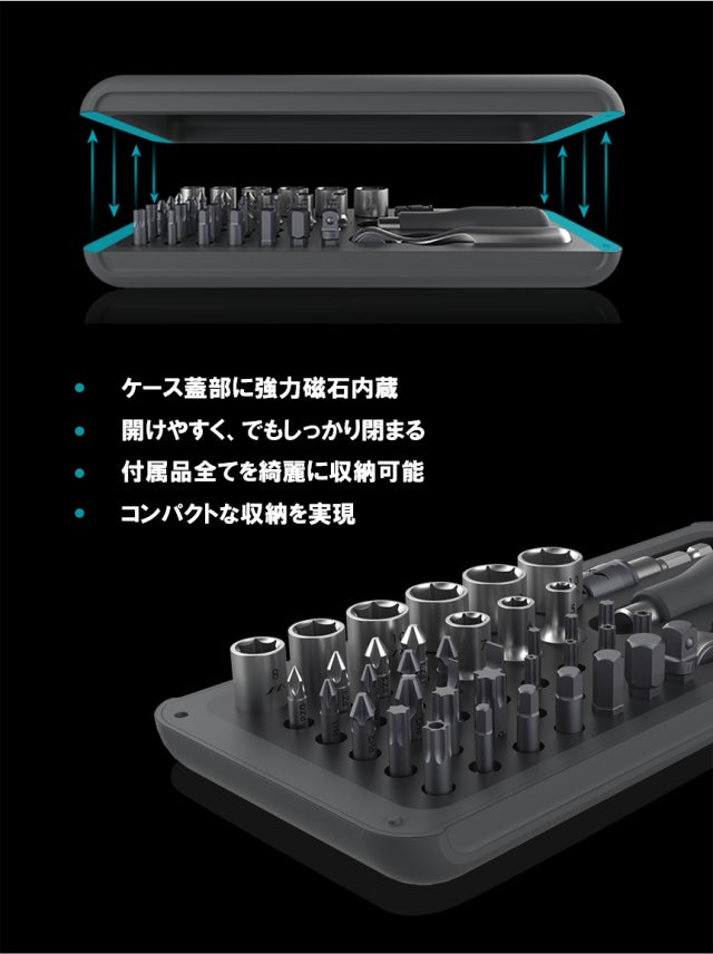 コンパクトなケースの中には、DIYや精密機器の修理で活躍する全41種のツールが揃っているため、追加でビットやソケットを購入する必要はありません。