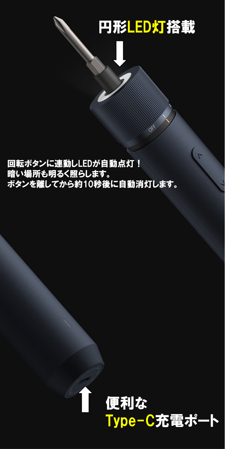 ドライバーの回転ボタンを押すと自動でLEDライトが点灯し、作業する箇所を明るく照らします。